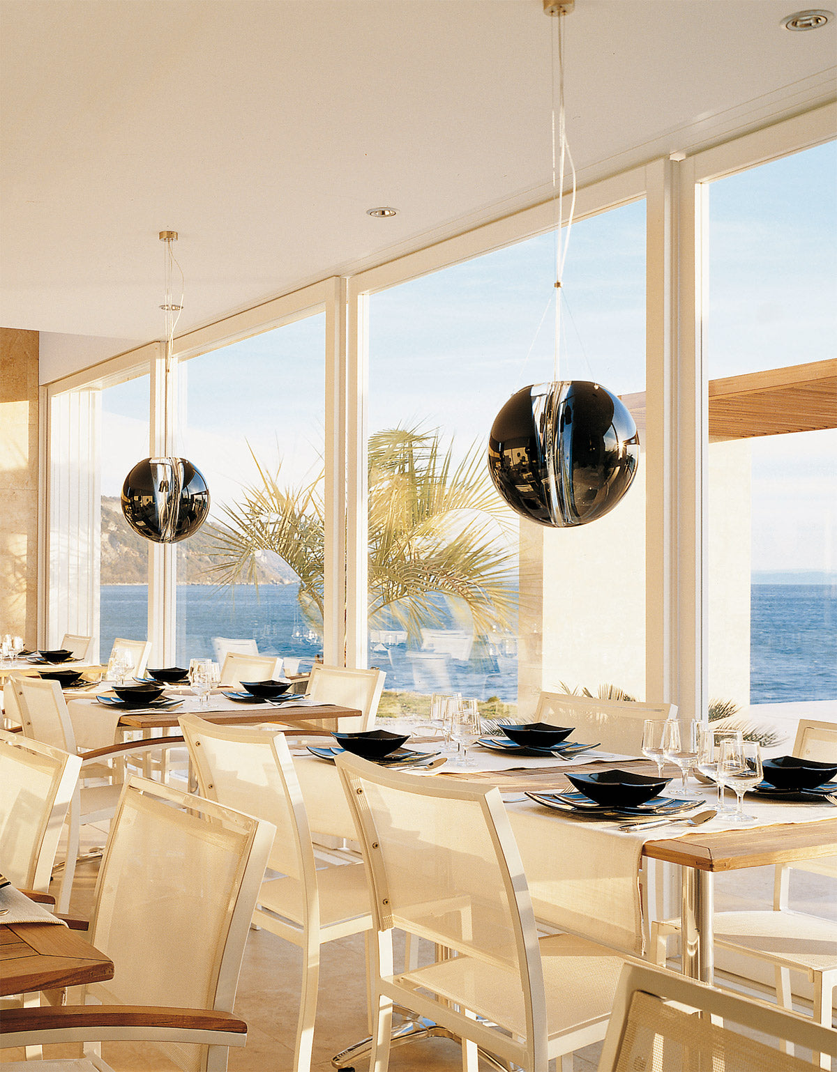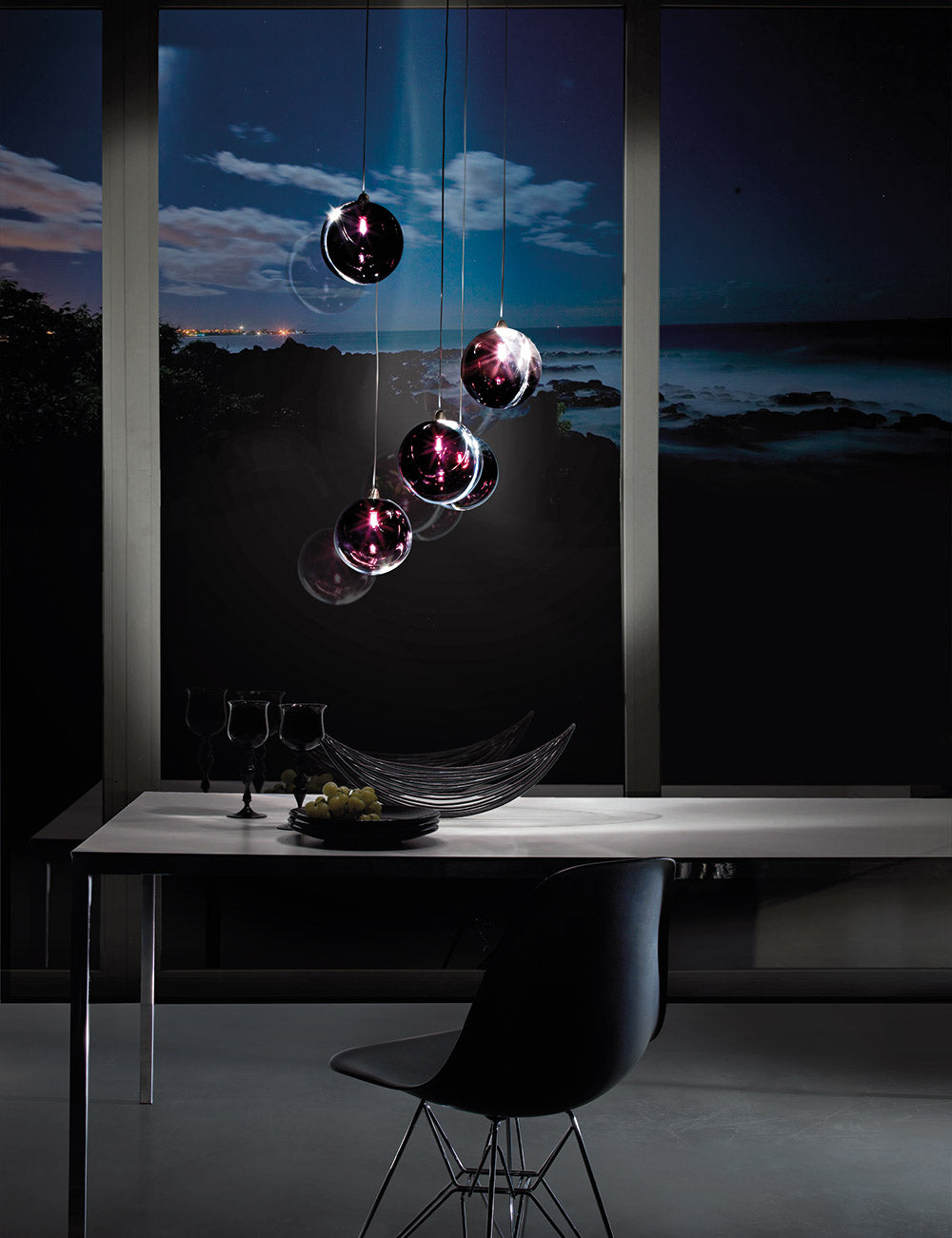 The Poc is a uniquely made hand-blown Murano glass Pendant. The spherical glass presents an internal membrane that acts as a lens to create the illusion of being made in two halves and adds a sense of dynamic change of intensity and colour at the surface that allows for the uniqueness of each piece. Please note that this colour of the Poc pendant is end-of-line with very limited stock.