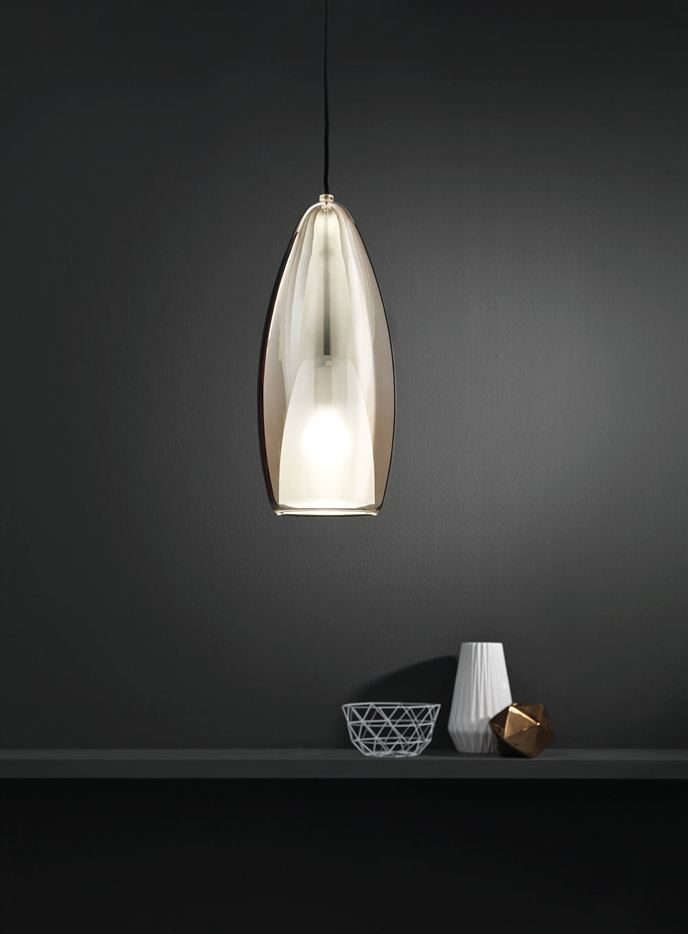Inspired by champagne flutes, the Flute pendant features an elegant modern design. Made from hand-blown glass and carefully handcrafted. The inner shade is satinated glass which acts as a diffuser, softening the light source. Available in a variety of colours and sizes. Custom variations of cable and metalware colours available on request.