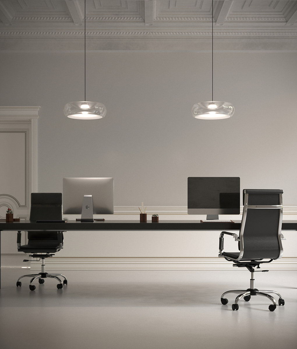 Fold by Cangini & Tucci produces a mirage of light through it's unique blown-glass design. Inspired by contrasts, Fold pendant creates an illusion of depth with a folded glass form which both conceals the in-built LED source and emits reflections between the top and bottom of the diffuser interior, producing a delicate glow within a space. Available in various sizes and a wide range of finish options with black or chrome metalware.