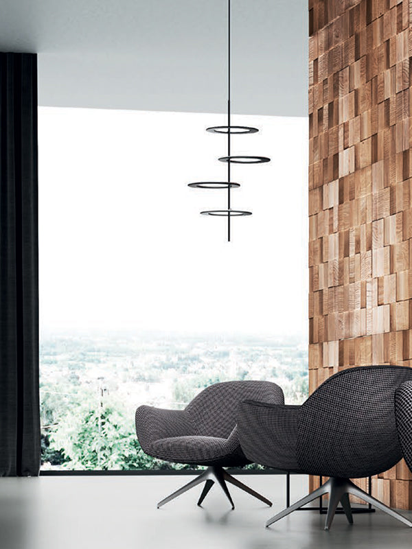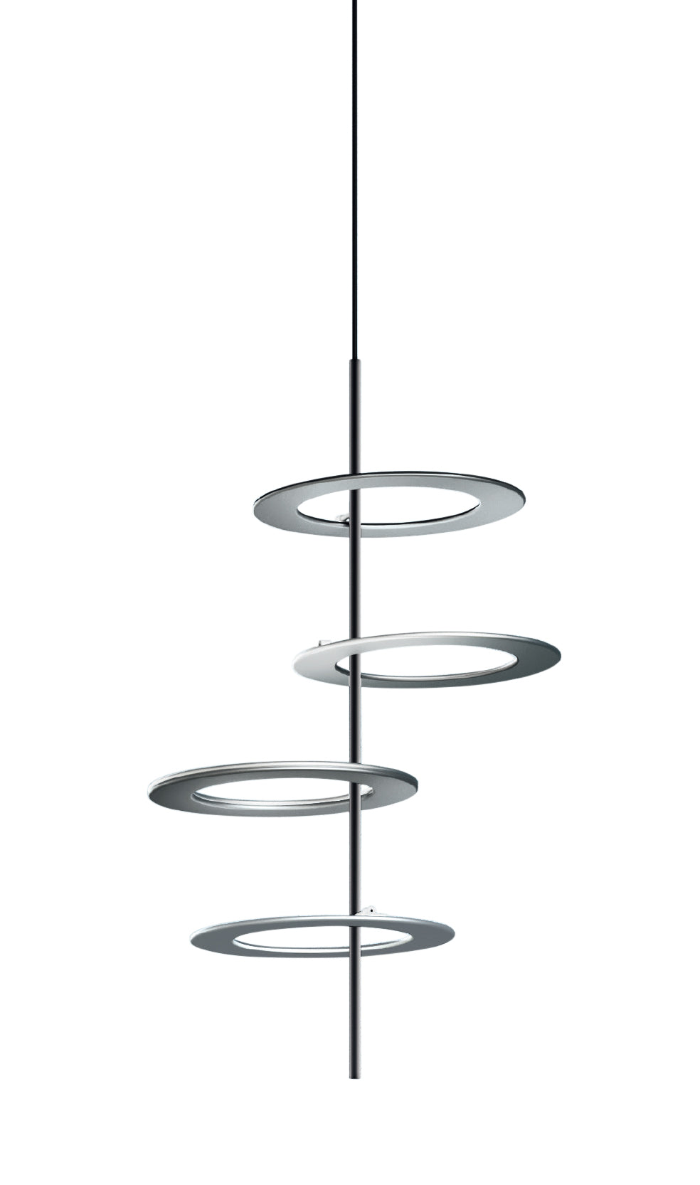 Hula Hoop pendant light is a minimalist fitting with a high energy LED source for modern applications. The unique design evokes the illusion of metallic hoops floating around a central element, creating a striking accent within a space. Available as 2 or 4 hoop version in a variety of finishes.