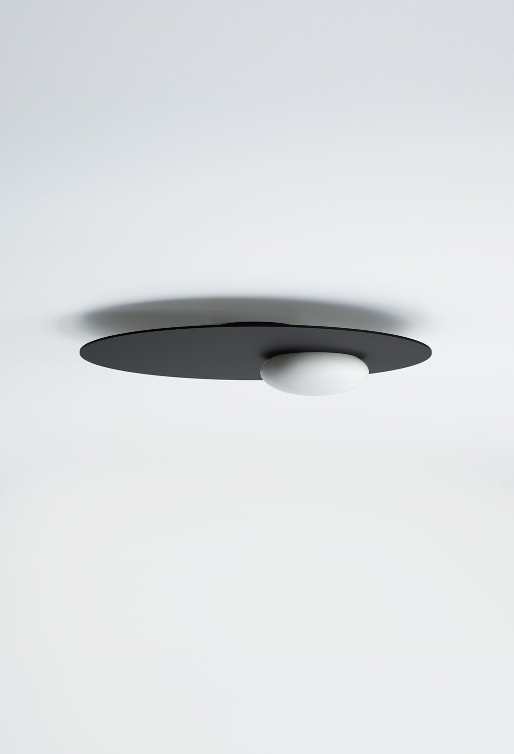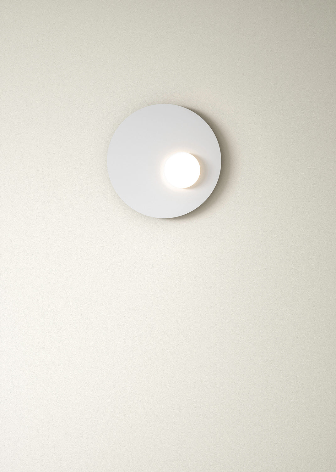 Kwic, designed by Serge and Robert Cornelissen, is a contemporary light fitting suitable for installation on ceiling or wall surfaces. A semi-spherical blown glass diffuser contains an integrated LED light source and overlaps - in a decentralized position - with a circular painted aluminium disk. Kwic embues a space with a powerful light which radiates from the opaline white diffuser, and a delicate glow that filters through the back of the frame. Depending on the location, Kwic can be a discreet presence or a point of focus in a room. Available in a variety of sizes and finishes.