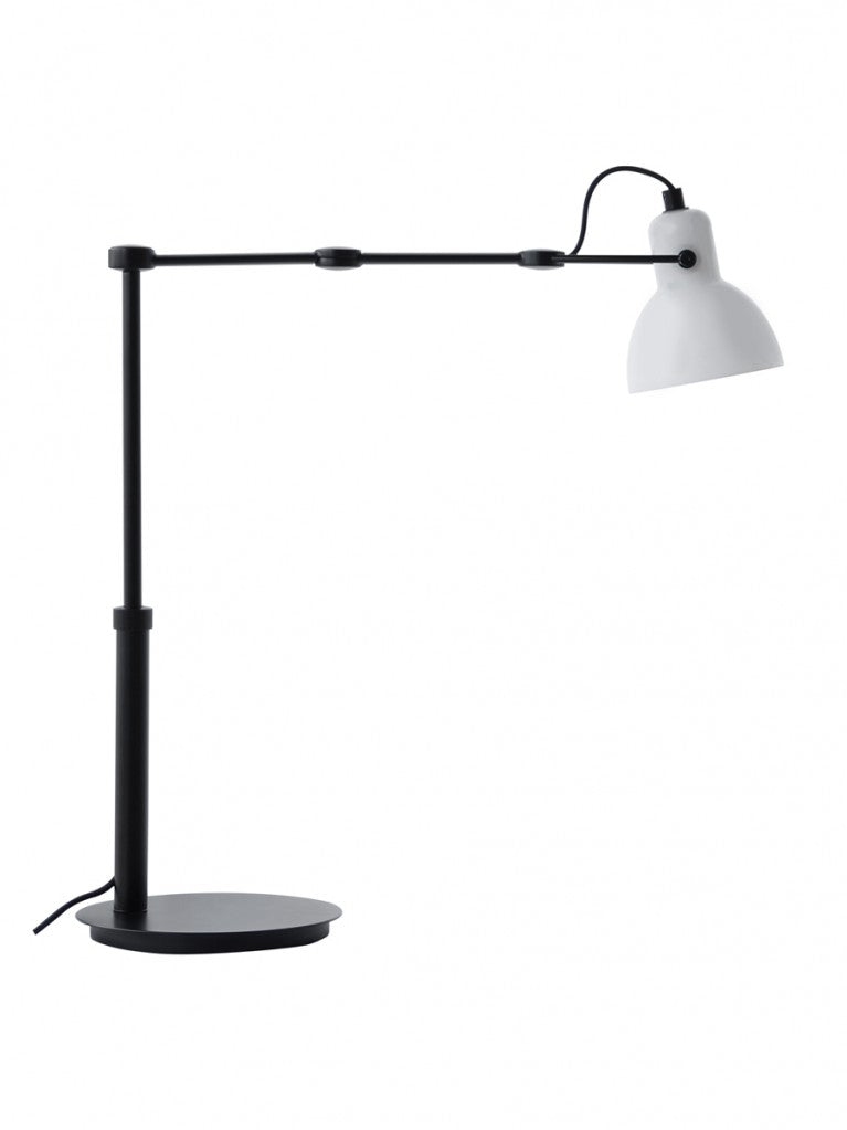 Laito is inspired by vintage lamp design. With a sturdy aluminium body and opal shade, the Laito boasts an updated classic look without compromising function. The specially designed fishbone structure enhances balance and allows rotation in the lampshade, while the arm provides additional adjustability. Available in black body and base with white shade or brass body and white base with white shade.