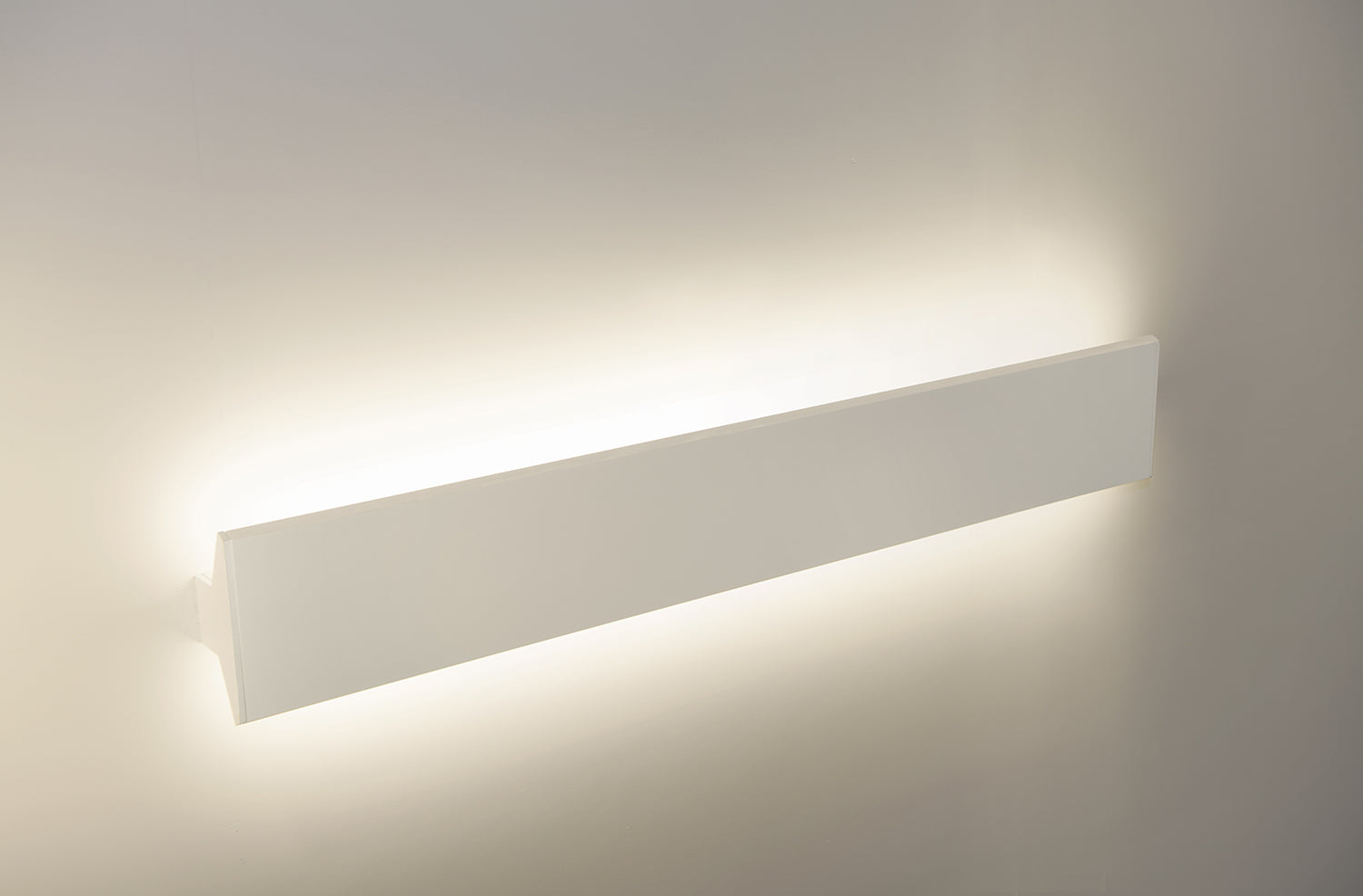 Long wall light provides indirect lighting in a minimalist contemporary form. Equipped with two inbuilt 12W SMD LED strips with a total 2600lm output. Leading and trailing edge dimmable. Available in black or white finish.