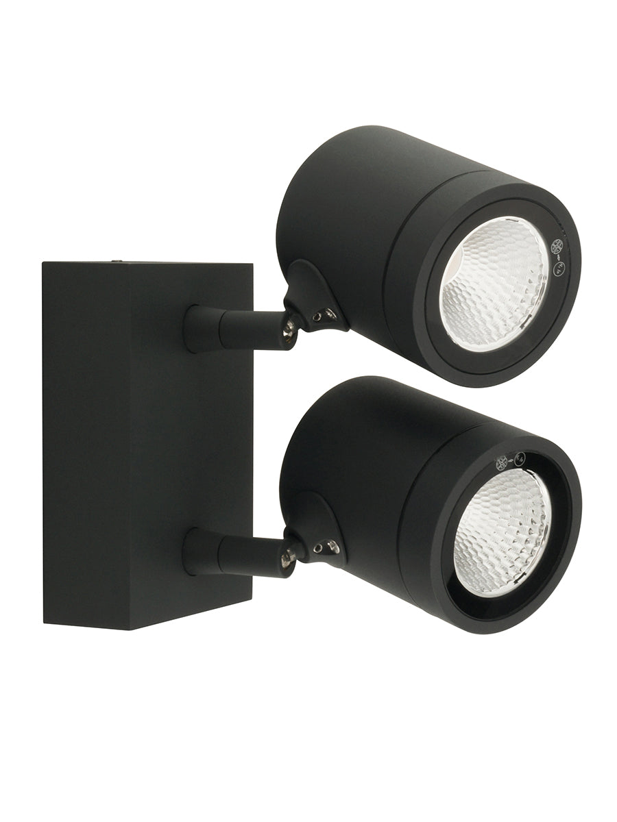 Myra is a surface mounted wall spot light for outdoor applications. Aluminium construction with two spot adjustable spot heads affixed to base. Each spot equipped with built in 8W LED source (960lm, 3000k, CRI 80) with 35 degree reflectors. Dimmable. Myra has an ingress protection of IP55 and an impact protection of IK06 with anti-corrosive coating. Available in anthracite finish. French designed.