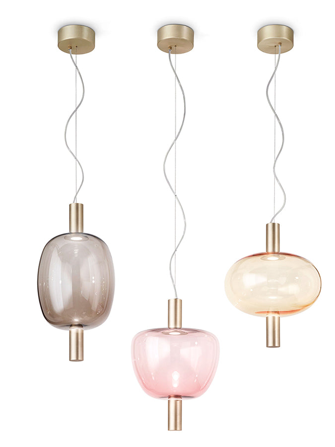 Born from the long partnership between Vistosi and Chiaramonte and Marin designers, Riflesso evokes soap bubbles and childhood memories. Made of mouth-blown glass, the LED source refracts and continuously rebounds within the shade, emitting glare free light in a space. Available in three different shapes enriched by crystal, smoke, amber or light amethyst glass with brass or copper base. Riflesso works well in cluster formations or individually. Winner of a 2019 Archiproducts Design Award.