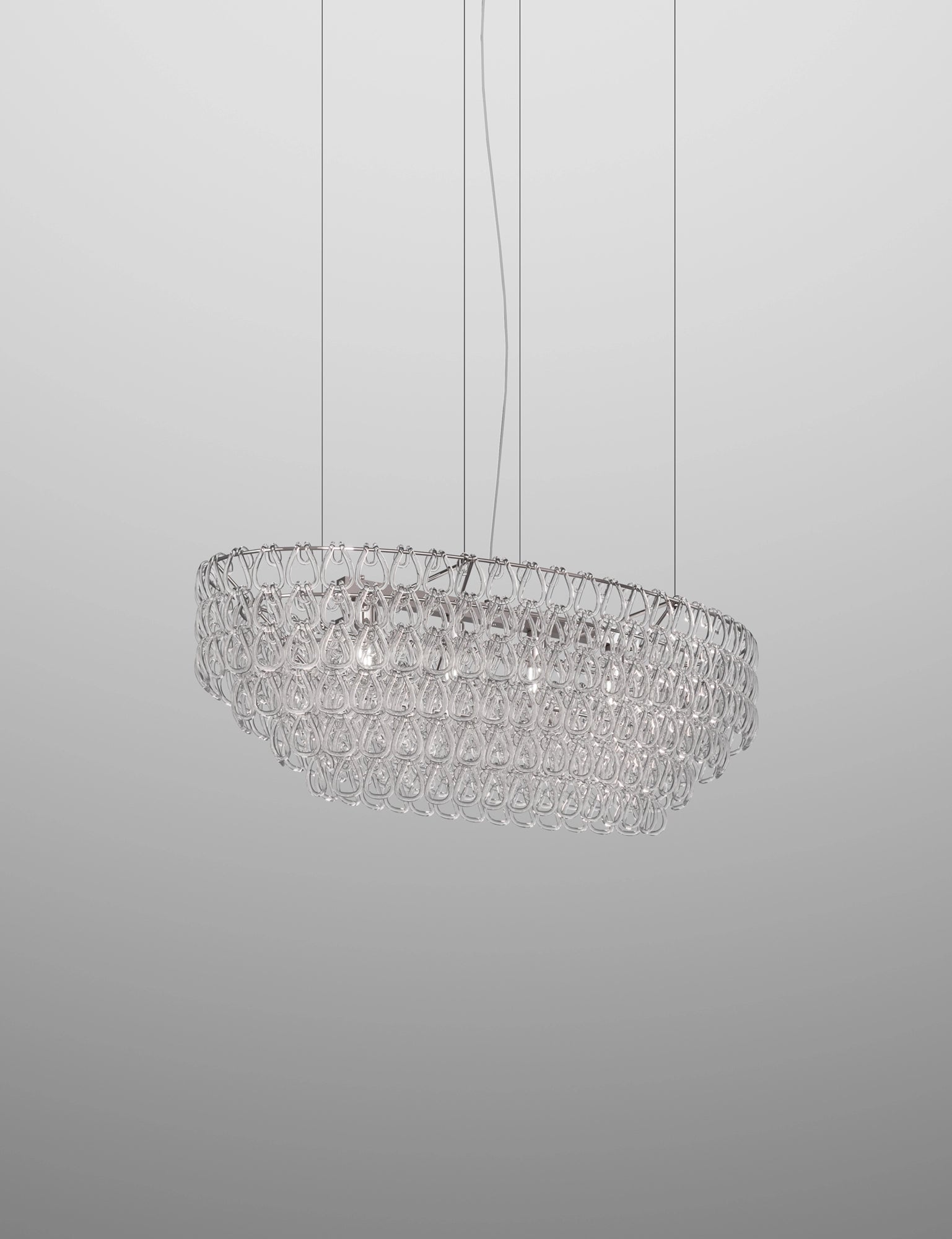 The Minigiogali collection from Vistosi expands Angelo Mangiarotti's classic Giogali range through utilising smaller hand made crystal links, providing additional style options. The Minigiogali Oval Chandelier comes with a bronze or chrome frame and a variety of different link colour options. Ideal for feature lighting installations in residential and commercial projects.