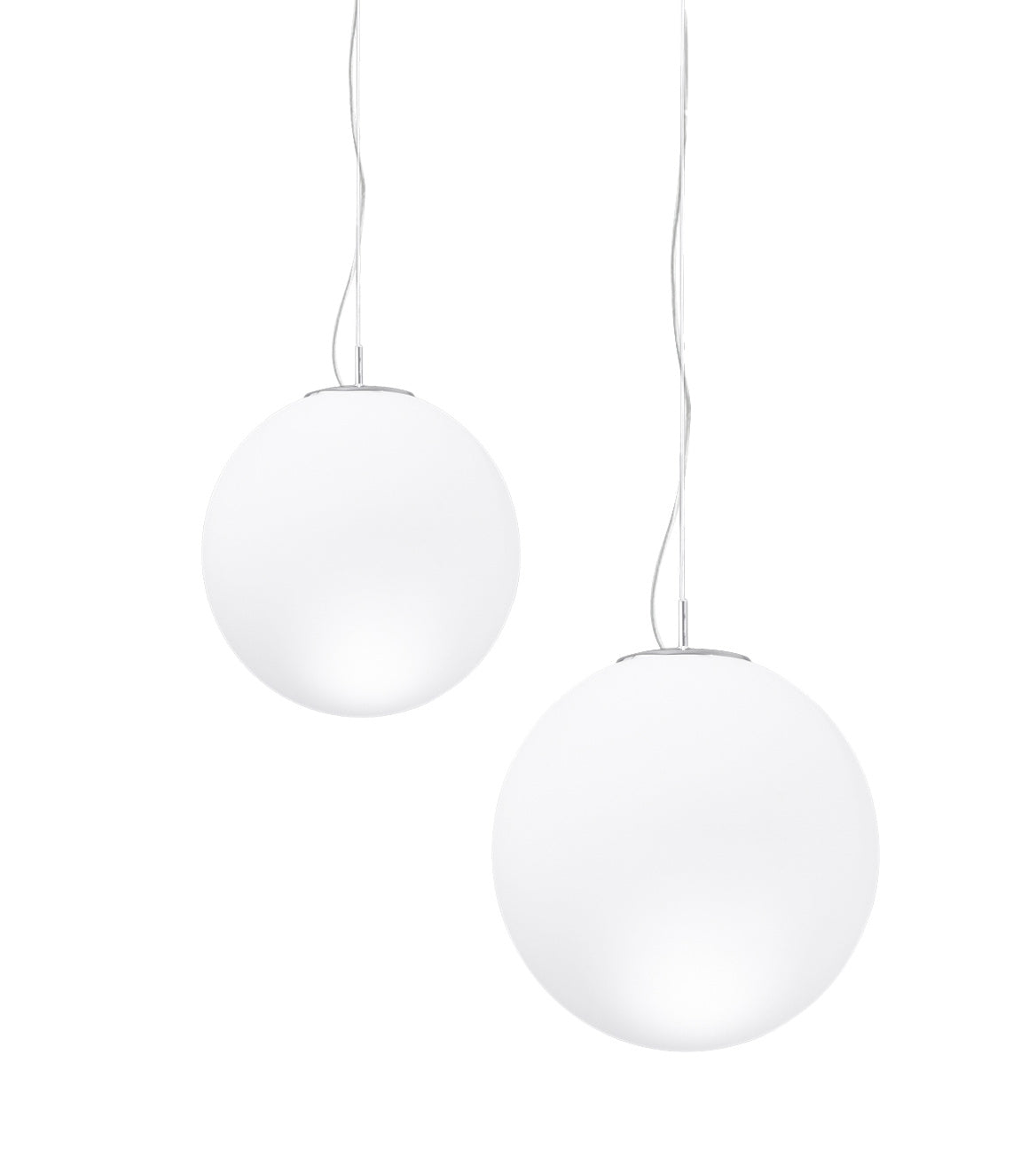 Asteroide is a globe shaped pendant lamp in triplex blown glass in opal matt white finish. Canopy, cable, and metalware in painted in white. Available in three sizes to suit any interior.
