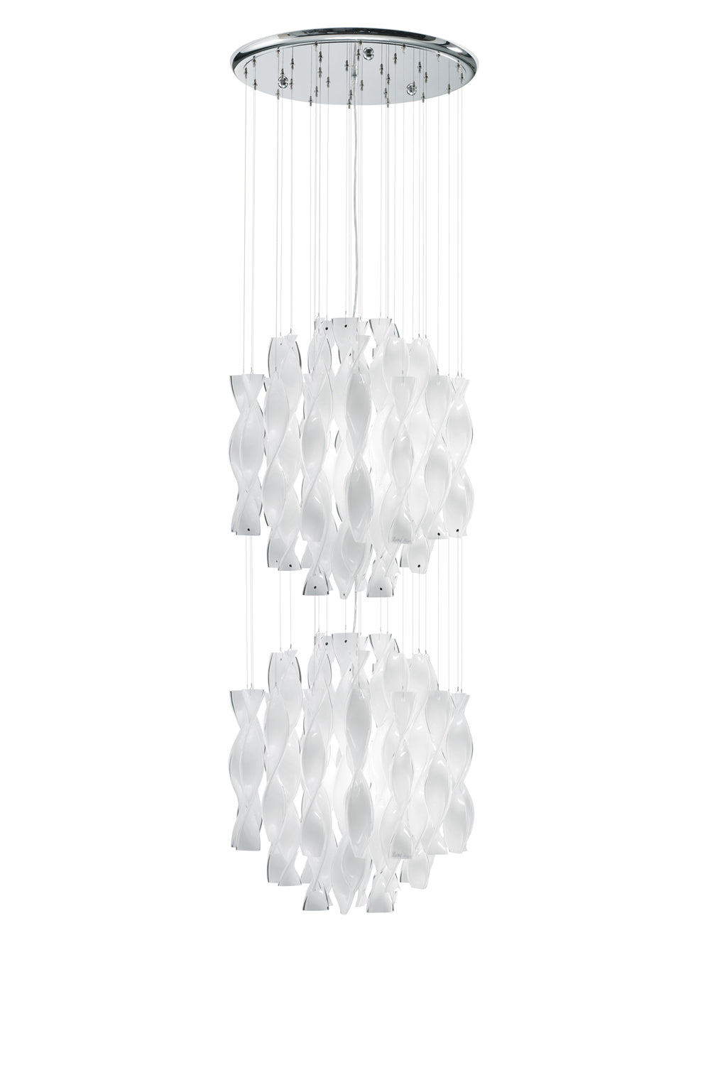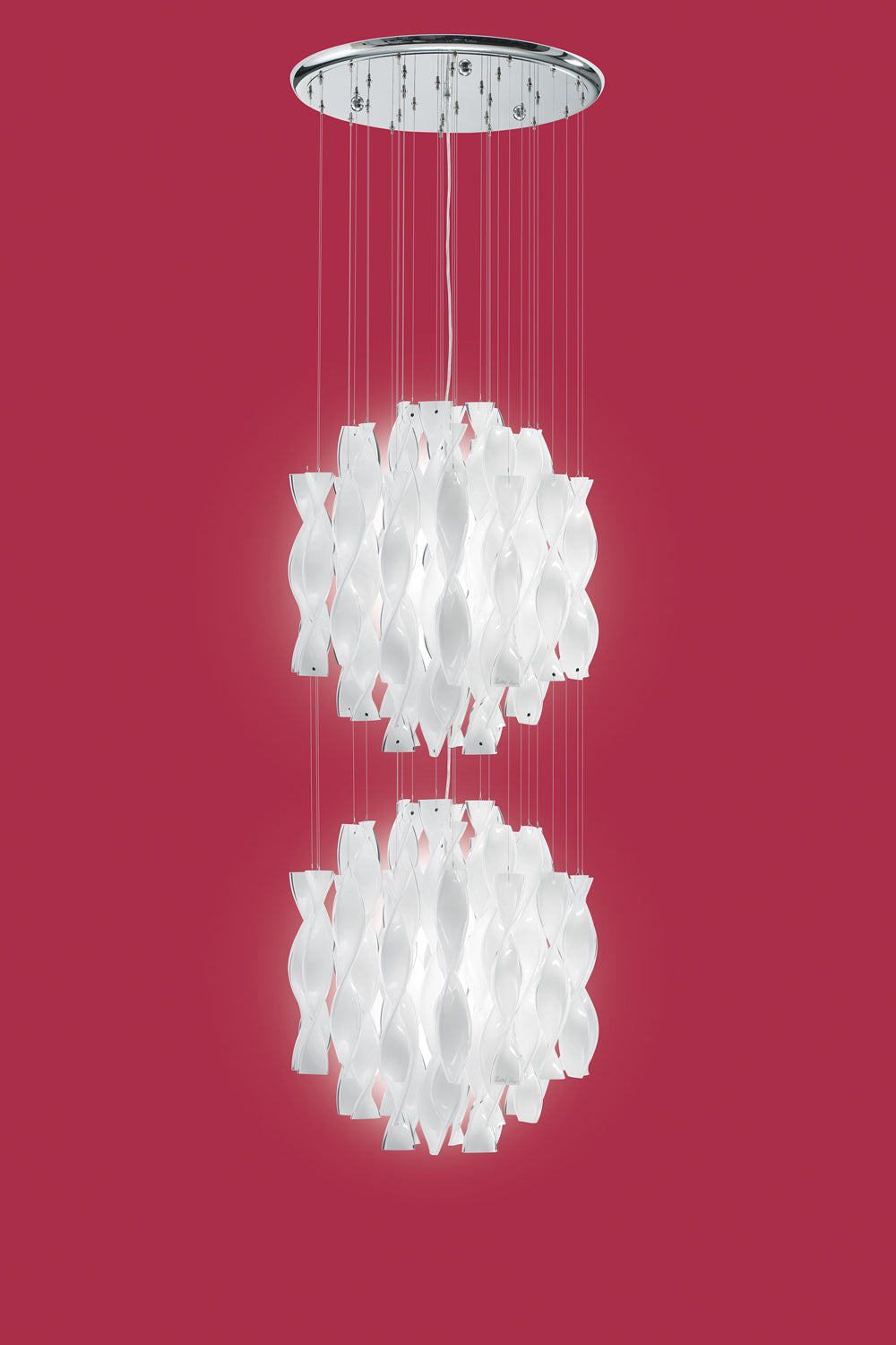Aura by Manuel Vivian features waves of light and dynamic reflections. The expertise and craftsmanship of a master glassmaker is expressed in the shape of the small glass ribons that together compose a fluid and aquatic form with a diffused glow. Aura double tier pendant light is available in two sizes with white, red, tea or crystal glass with a polished chrome mounting plate.