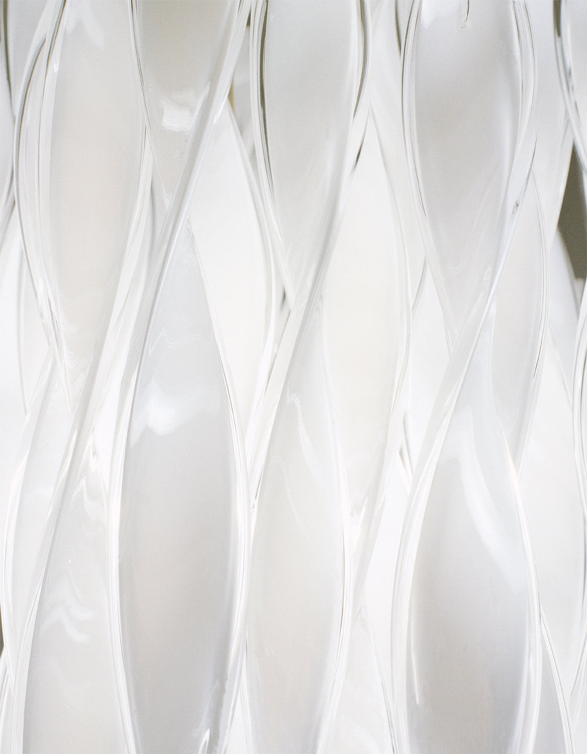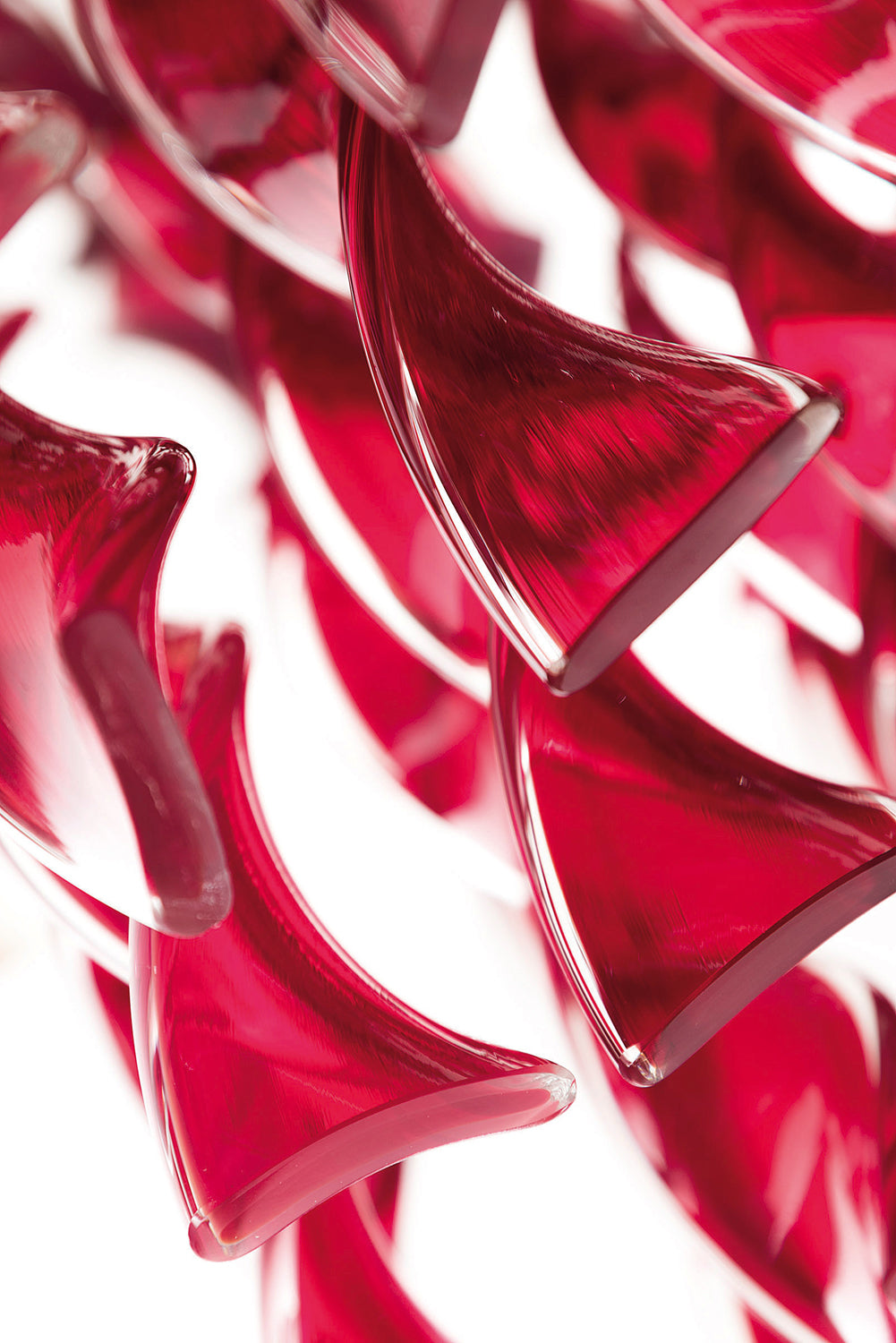 Aura by Manuel Vivian features waves of light and dynamic reflections. The expertise and craftsmanship of a master glassmaker is expressed in the shape of the small glass ribons that together compose a fluid and aquatic form with a diffused glow. Aura ceiling light is available in various sizes with white, red, tea or crystal glass with a polished chrome mounting plate.