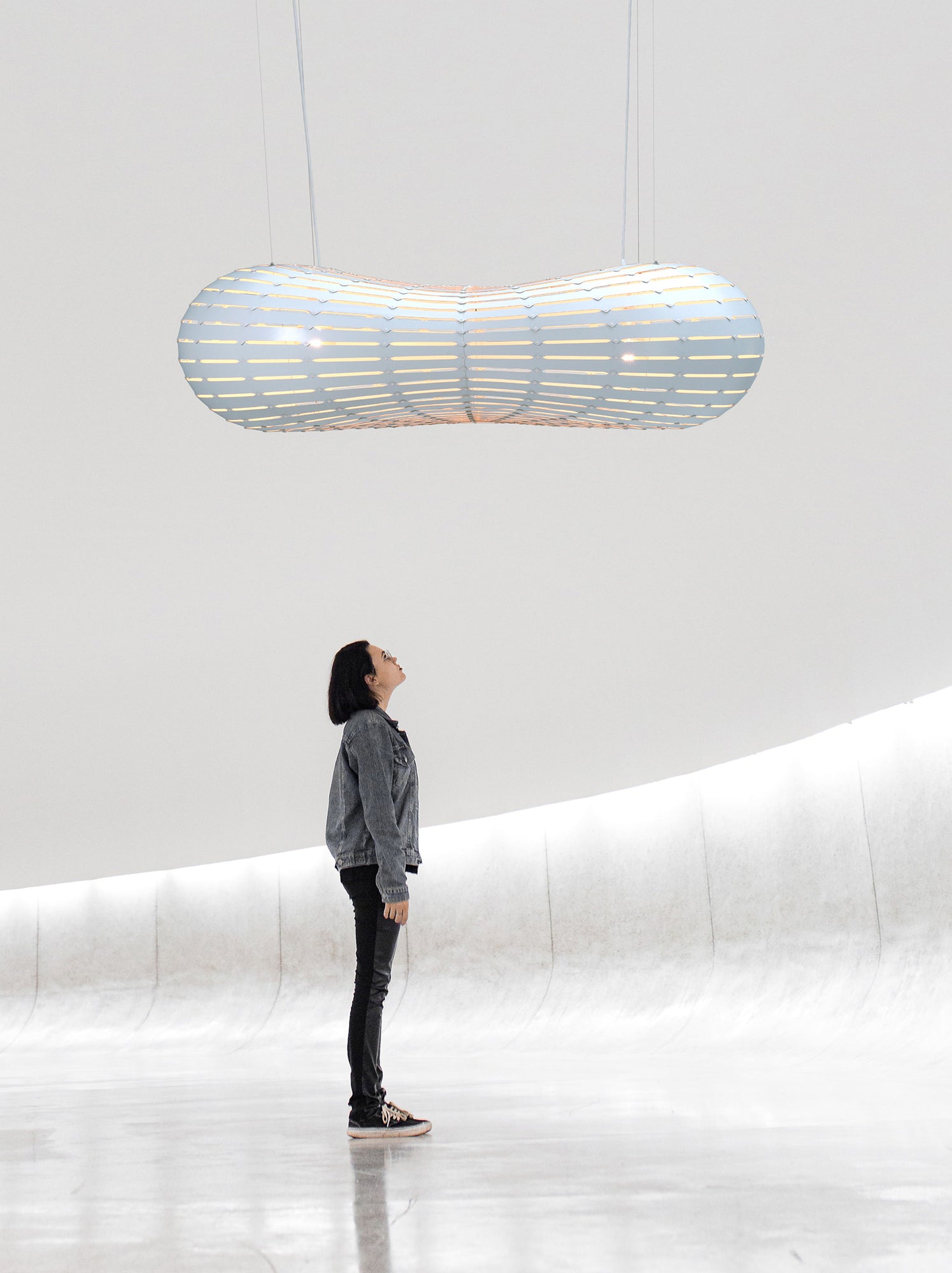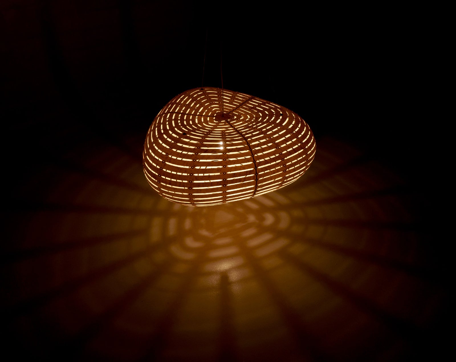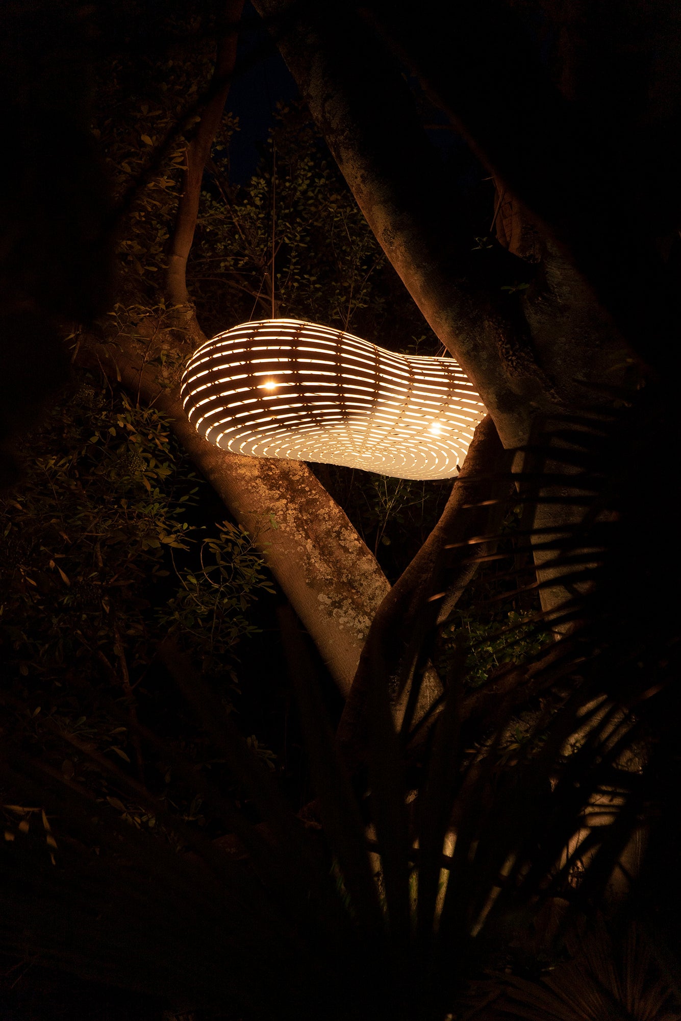 Cloud by David Trubridge was first launched in 2008 as part of the Spiral Islands installation of matching lights and settees. It was inspired by the clouds that David saw sitting over small islands across the Pacific Ocean, which were used by Polynesian navigators to find islands from afar. The original Cloud lights were made with frosted plastic but were later discontinued due to the negative environmental impact of the material. Cloud has been reimagined in this new version which is made almost entirely of bamboo plywood. This allows light to shine through while offering a similar visual lightness as the former translucent plastic version.
