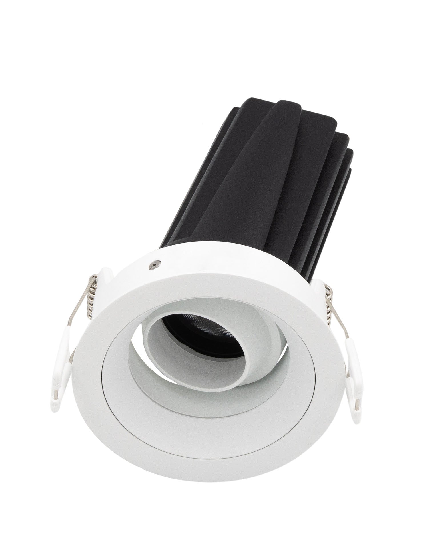 The Arcolight Darc 80 Gimble is a compact adjustable recessed downlight with a gimble fascia allowing 25-degree tilt and 355-degree rotation for precise light aiming. Equipped with an 11W LED delivering up to 814 lumens with exceptional 97 colour rendering index and SDCM less than 2 for outstanding colour consistency. Available in 15-degree 24-degree 36-degree and 50-degree beam angles. Rated IP54 and IC-4 with UGR less than 14 for superior glare control. DALI or phase cut flicker free dimming options available. Offered with black or white spring trim and black or white gimble fascia combinations. The Darc 80 Gimble Downlight is part of the Arcolight collection showcasing premium architectural lighting curated by Studio Italia.