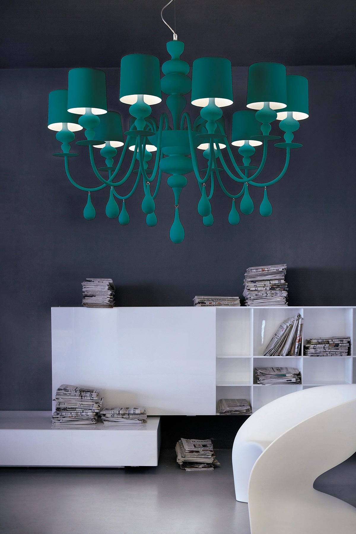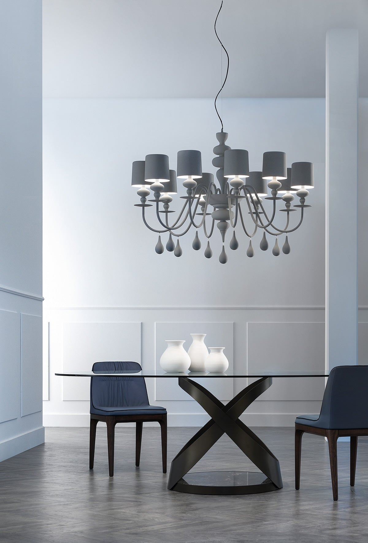 The Eva collection magnificently embodies a modern interpretation of classic chandeliers. Like a blossoming flower, Eva enchants with fluid sinuosity and conveys a sense of calm. The chandelier features a resin and polyurethane frame with aluminium shades, accentuating its modern aesthetic. Available in three sizes and a variety of finish options.