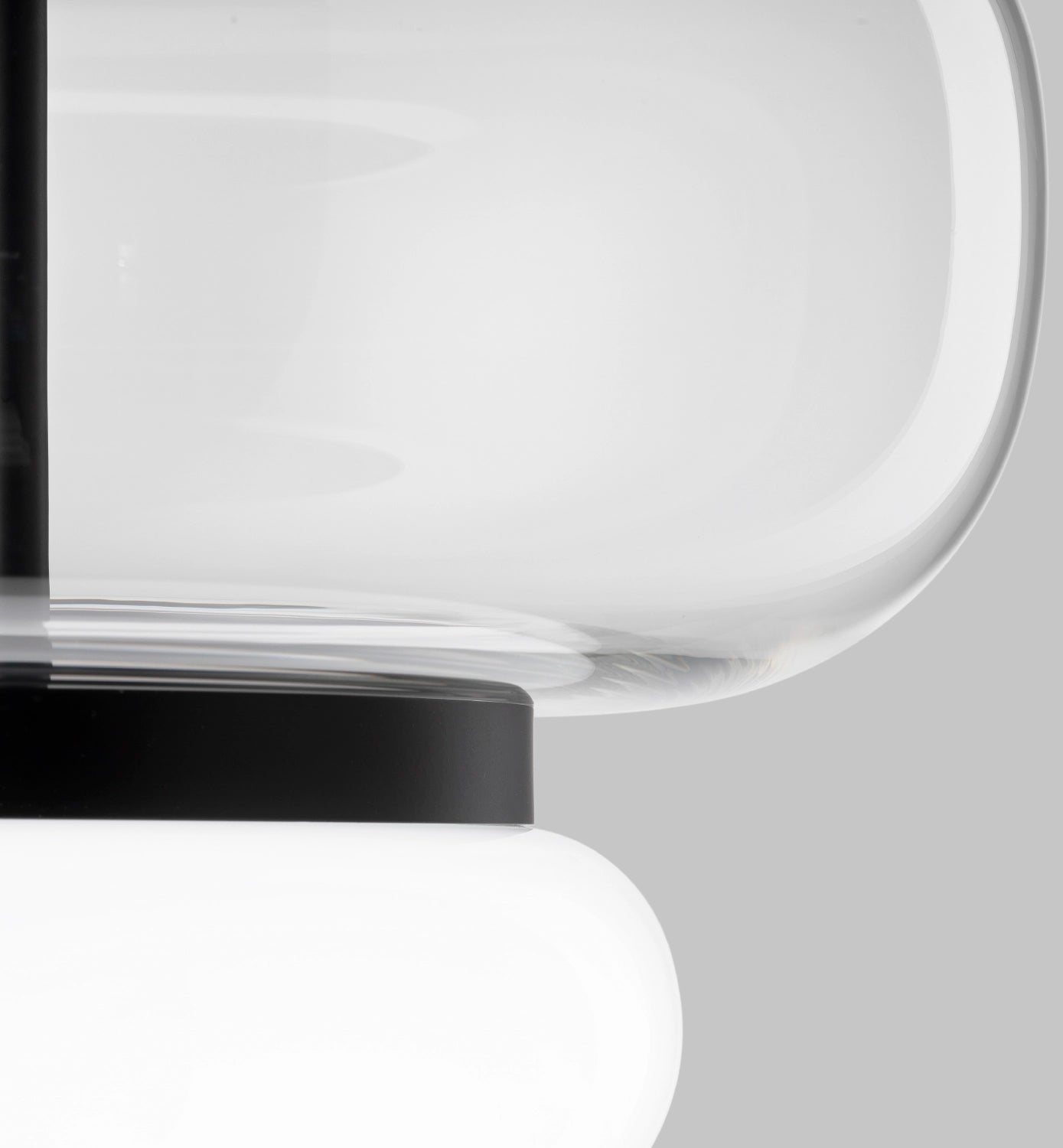 The Faro ceiling light, by Oriano Favaretto for Vistosi, draws inspiration from lighthouses, serving as a symbolic link between sea and land. Two glasses, one with a transparent finish evoking the Venetian lagoon, and the other glossy white representing the mainland, are united by a metal ring-a central and safe lighthouse element. Concealed within the white glass is an LED light source, offering a diffused and non-sparkling glow. Faro, a visible design centerpiece, stands out in any space, embodying stability and recognition from all angles. Available in a variety of finish options.