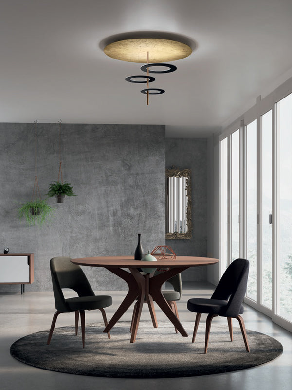Hula Hoop ceiling light is a minimalist fitting with a high energy LED source for modern applications. The unique design evokes the illusion of metallic hoops floating around a central element, creating a striking accent within a space. Available as 2 or 3 hoop version in a variety of finish combinations.