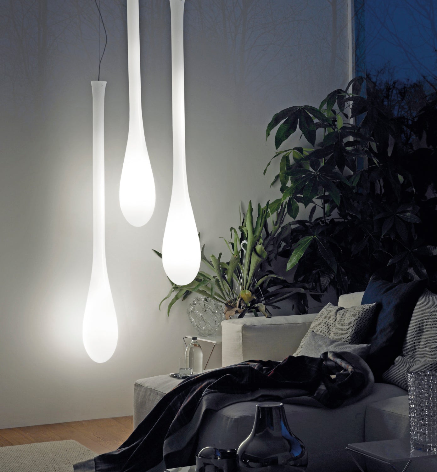 The Lacrima Pendant features a white elongated tear drop design that makes it perfect for staircases, voids and high ceilings amongst other applications. Lacrima is available in two sizes. Hand made in Italy by Vistosi.