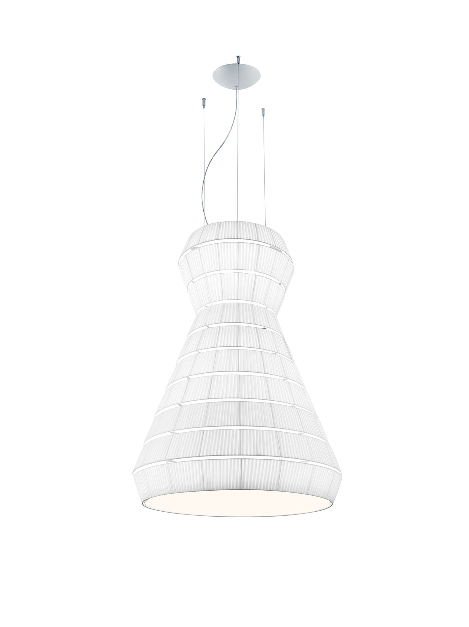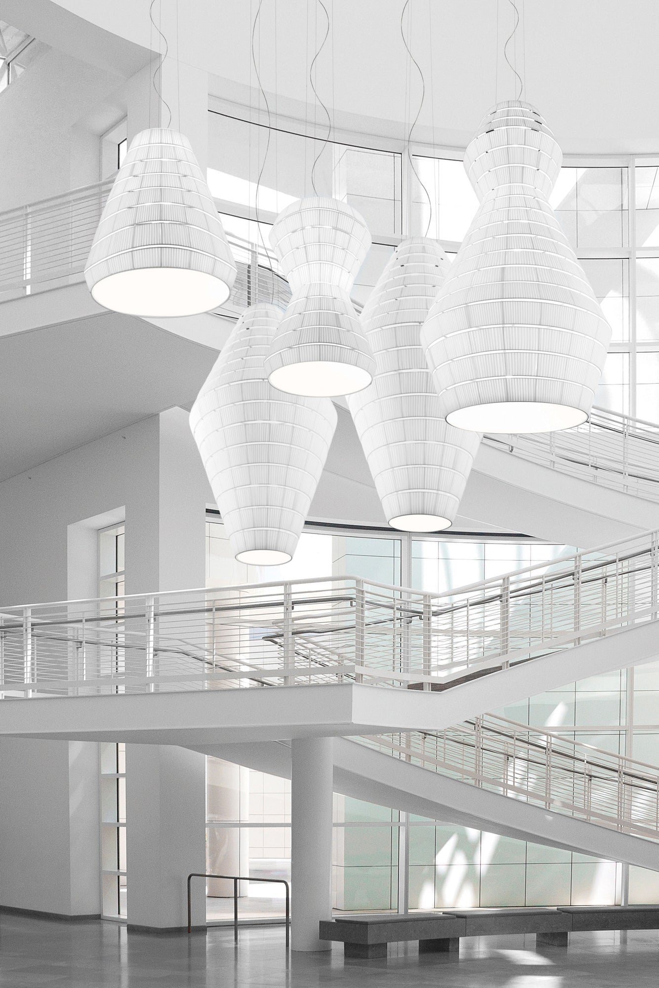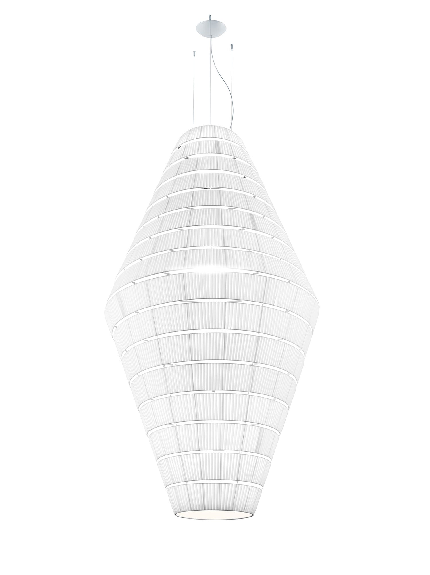 The Layers collection of suspension lamps combines geometric shapes to create a bold, sculptural presence. Its modular, layered design allows for customisable forms, providing versatile installation options. Despite its substantial volume, Layers remains lightweight, making it ideal for larger areas. The fabric texture and structure have been tested to reduce noise by up to 47%. With an Equivalent Absorption Area of up to 5.78, Layers offers exceptional sound-absorbing performance. Various sizes available in warm white or white finish. Collaborative design by Timo Ripatti, Manuel and Vanessa Vivian.