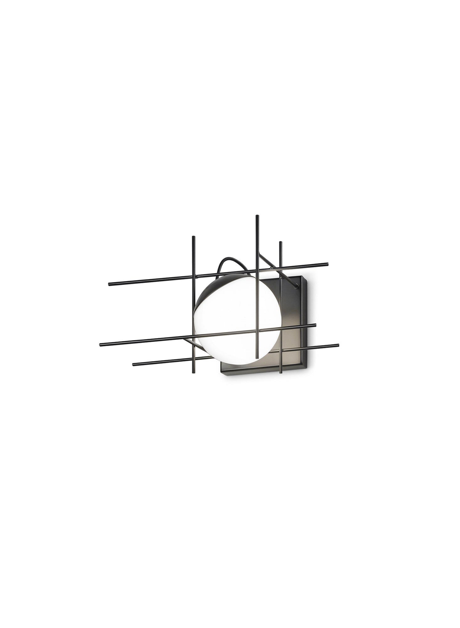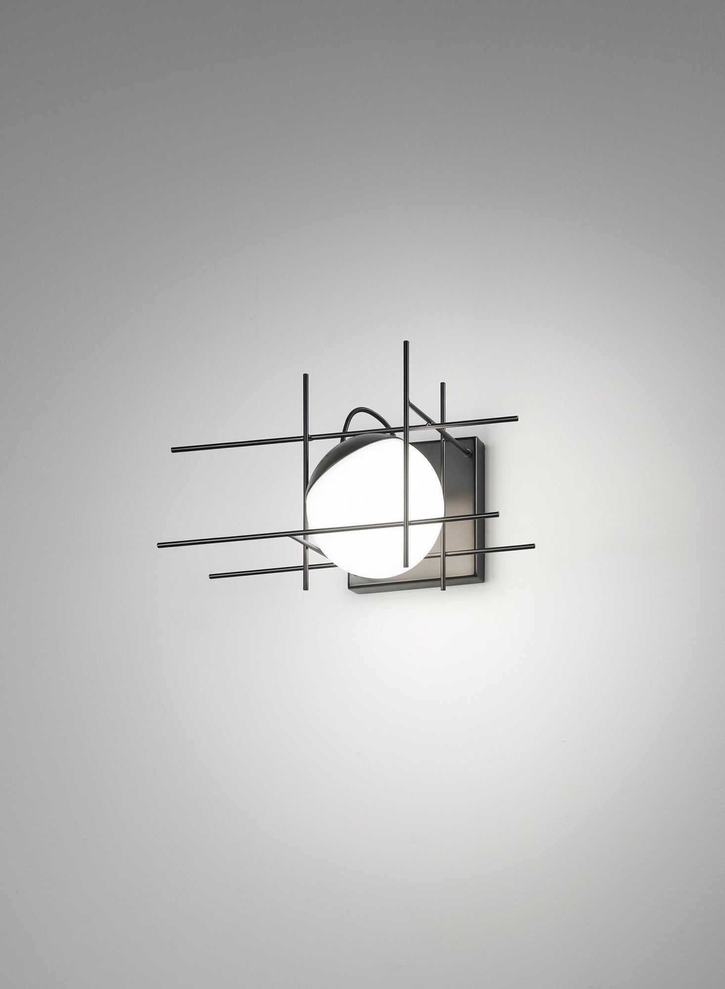 The designing principal of Plot Frame Wall Light was to render a sphere of light in suspended motion. An almost hovering luminescent sphere is supported by a metallic weft, creating an exquisite and unique form. The metal cap of the lamp body acts as a heat sink for the in-built LED source and is fixed to the glass by means of a pressure system achieved by the perfect adhesion between the edge of the glass and the cap itself. Available with matt black metal finish and white blown glass diffuser. Hand made in Italy by Vistosi.