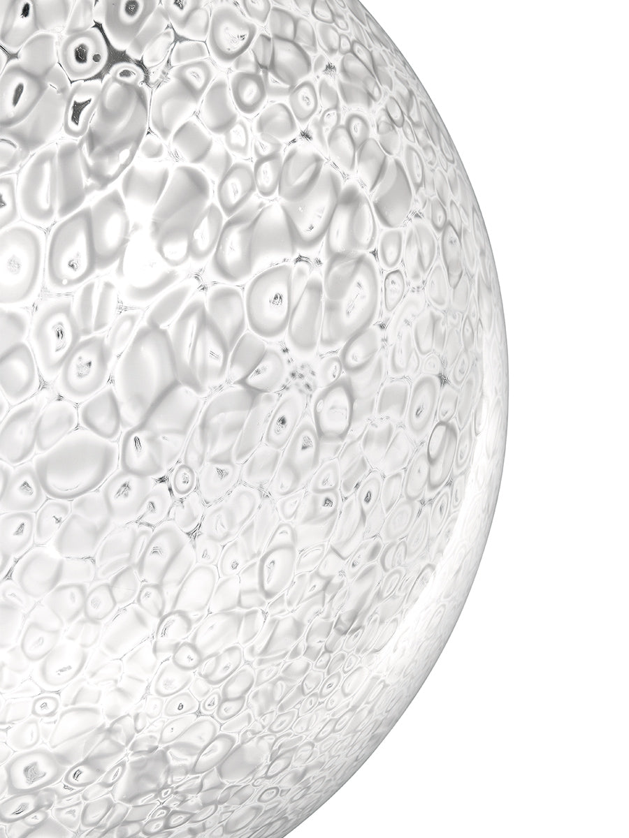 The Rina spotlight is a beautiful Murano glass fitting that is accented by white murrhines added during the blowing process creating a mottled effect and concealing the light source. When the light is on it emits a soft speckled light around a space. Rina spotlight can be mounted on wall or ceiling surfaces.