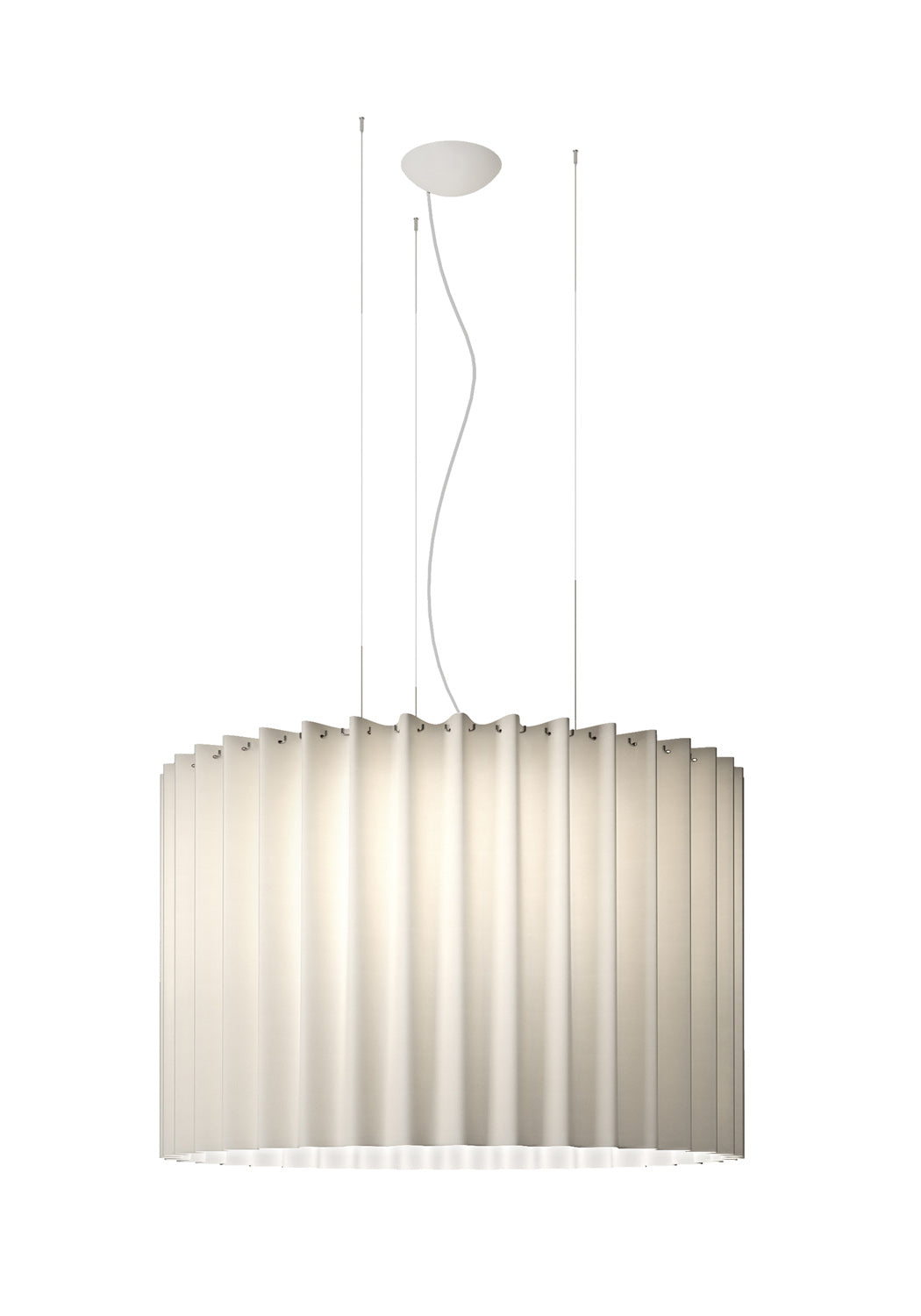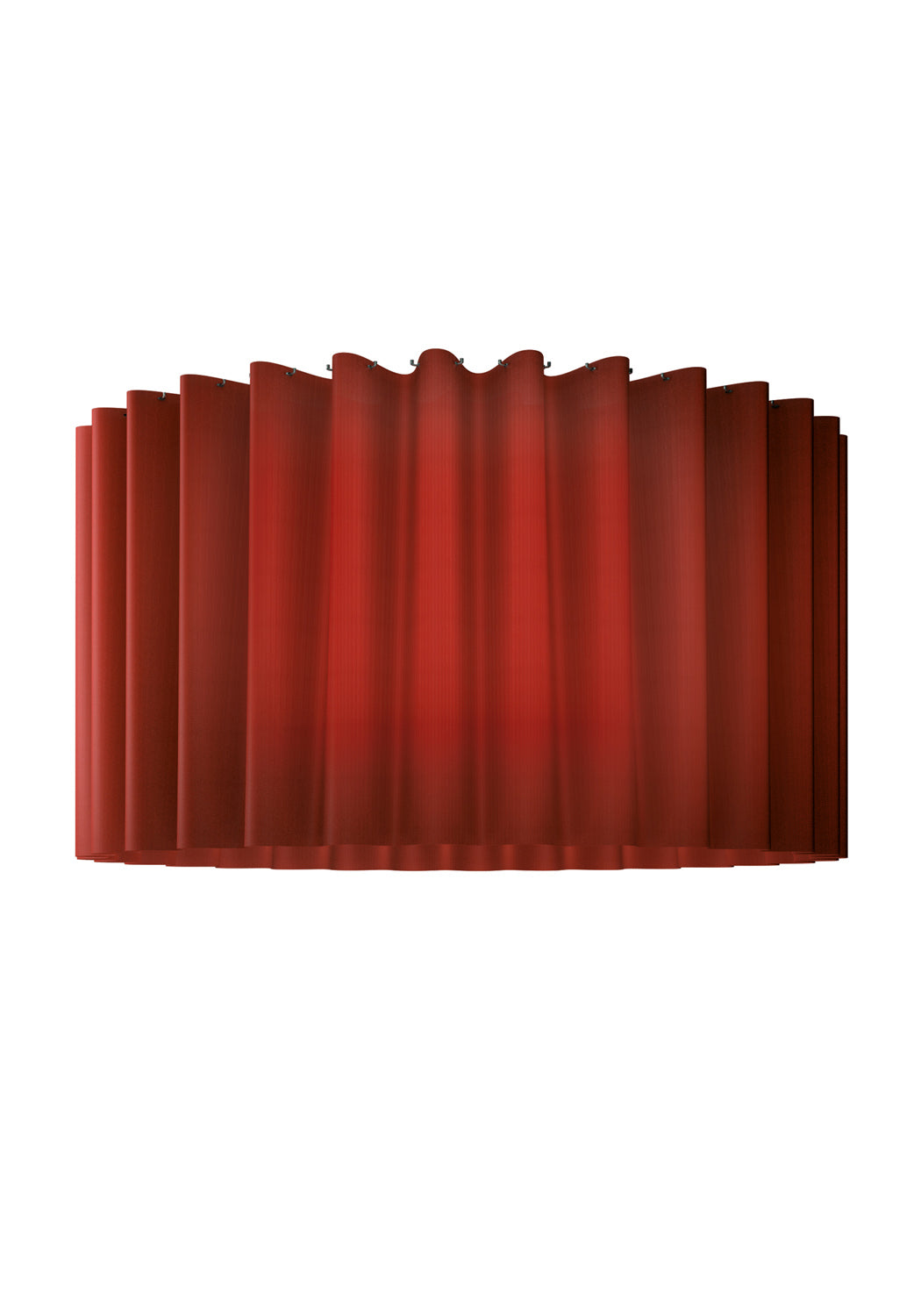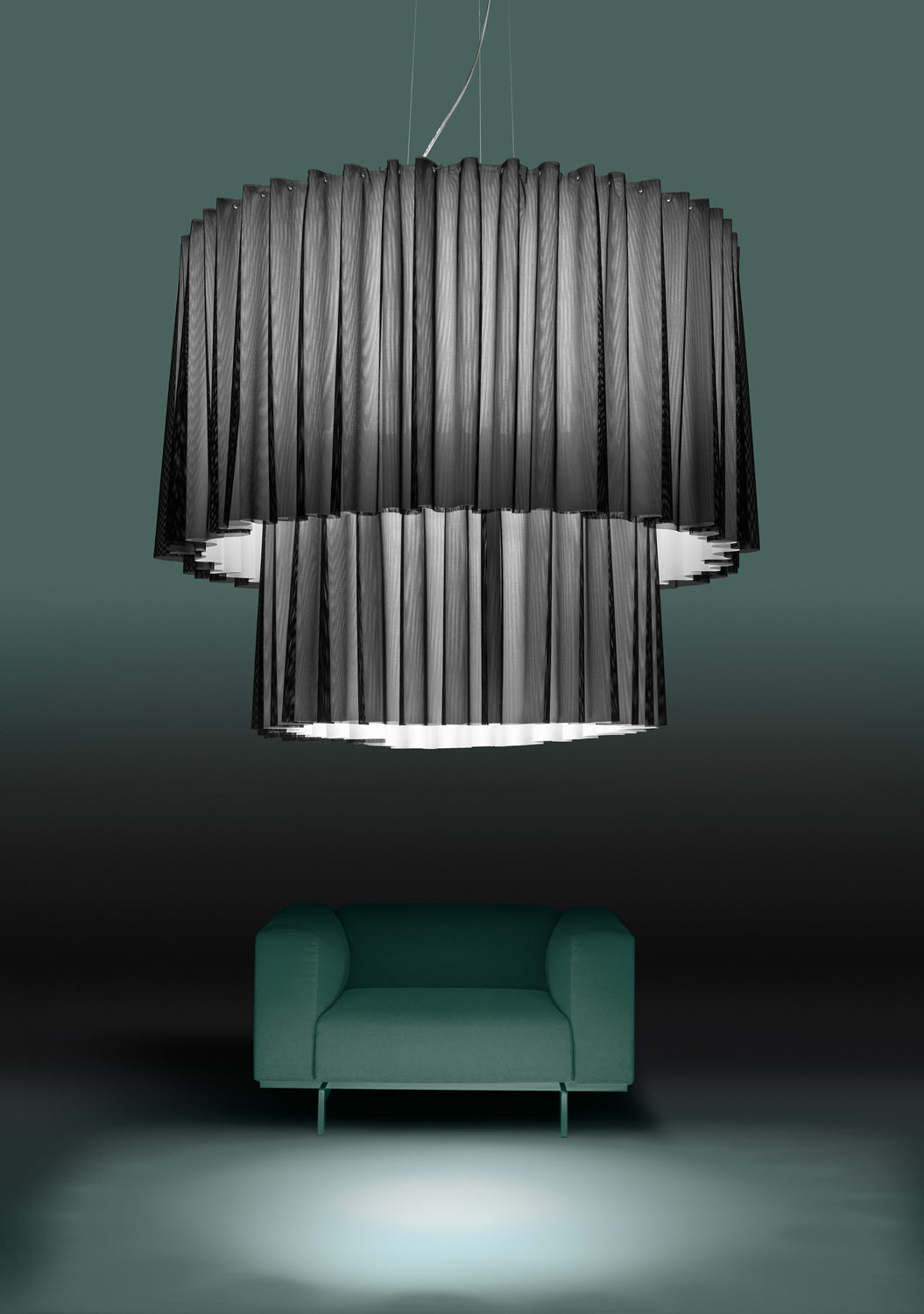 Skirt takes inspiration from the world of fashion. The result is a collection of pendant lamps with a unique and elegant design, given by its sinuous shapes. Skirt's refined design allows it to adapt to different types of environments, from domestic to contract and hospitality. It's lampshade is composed of a fabric that also has sound-absorbing properties, which allow it to reduce noise by up to 53%, thanks to its Equivalent Absorption Area which reaches a maximum of 3.55. Further, the shade has a double curtain effect in TREVIRA CS fabric, a fire retardant textile. Skirt is available in a variety of sizes and finish options.