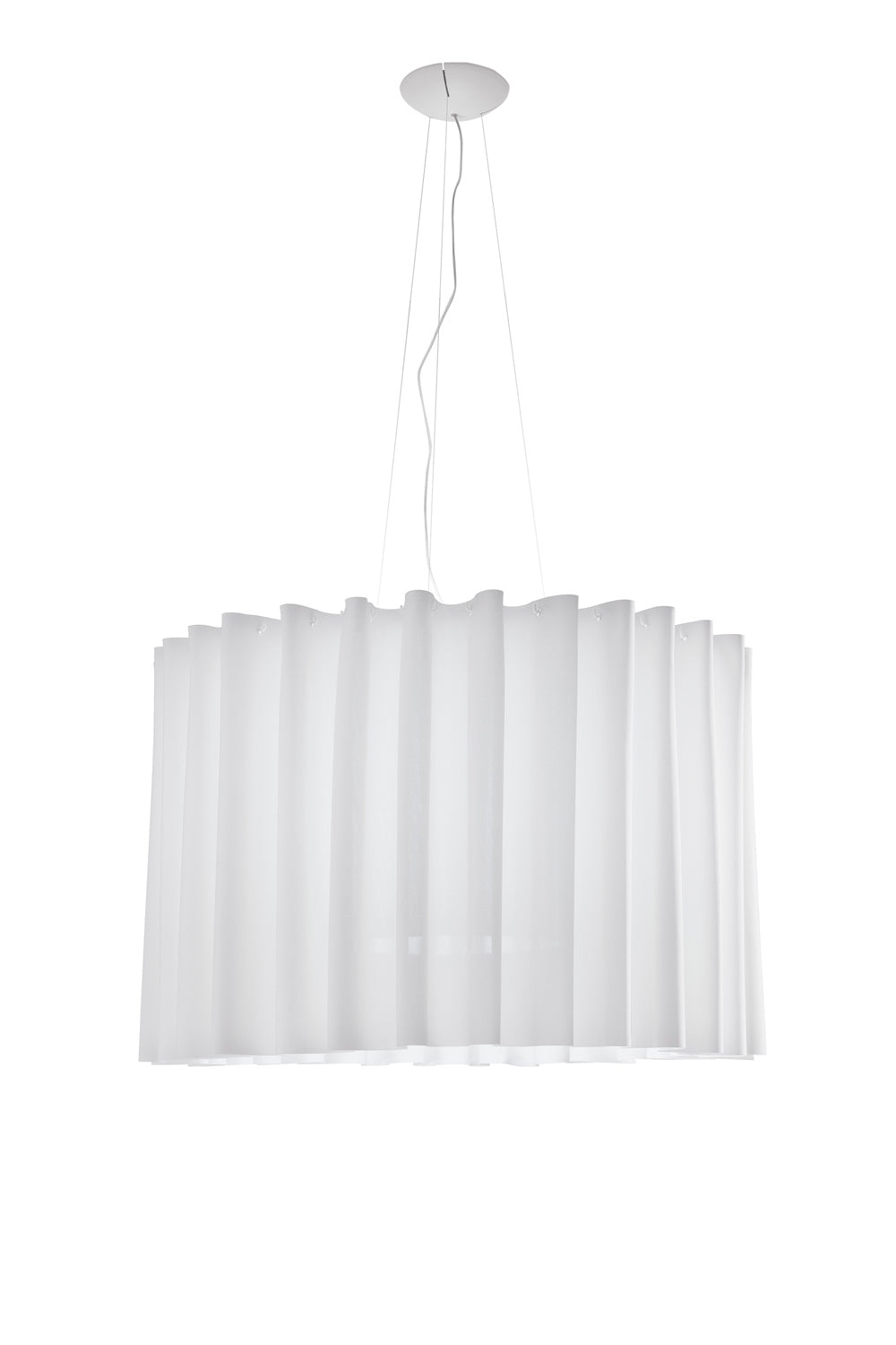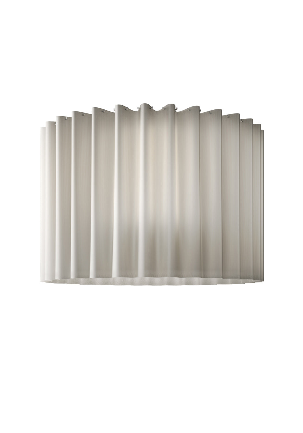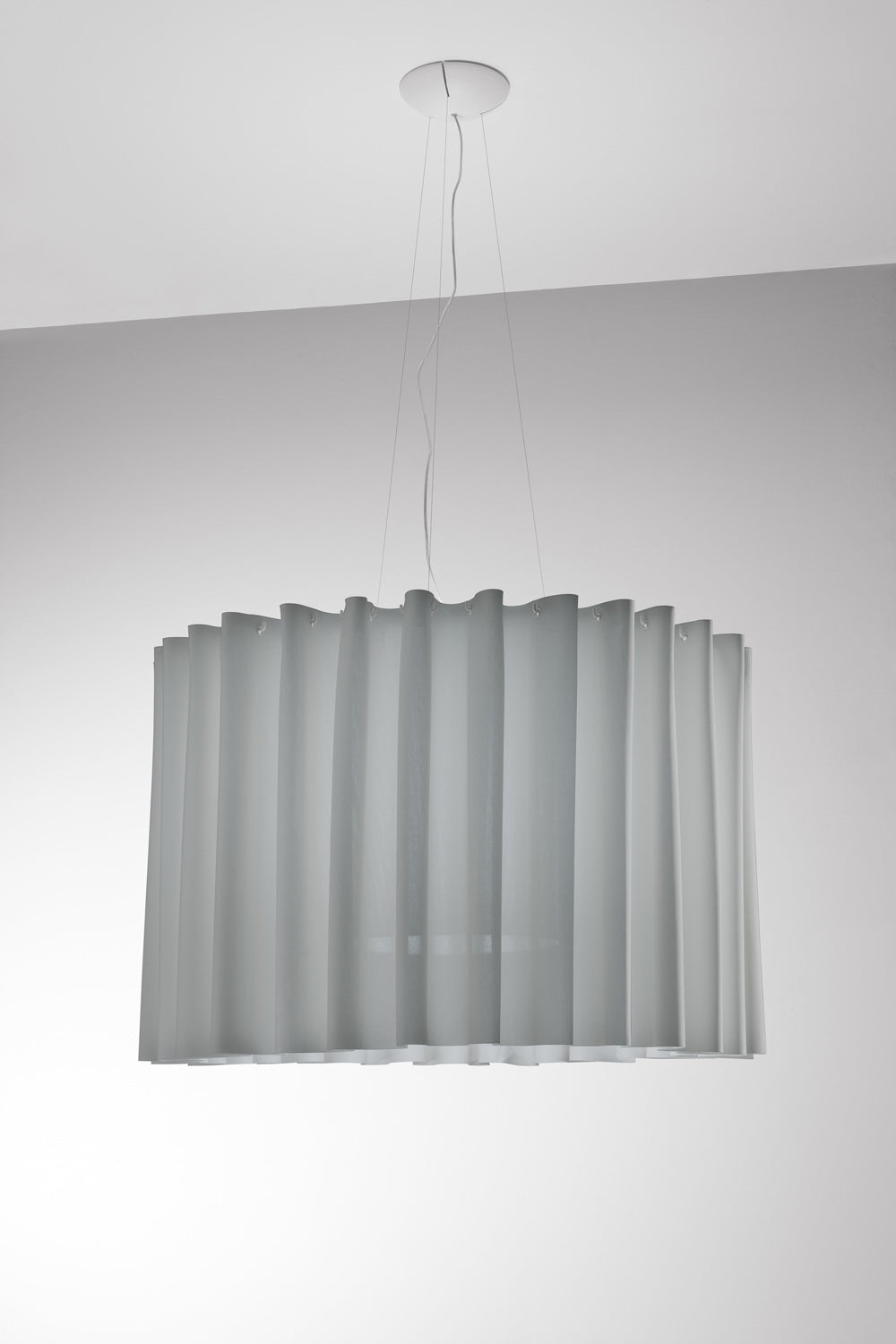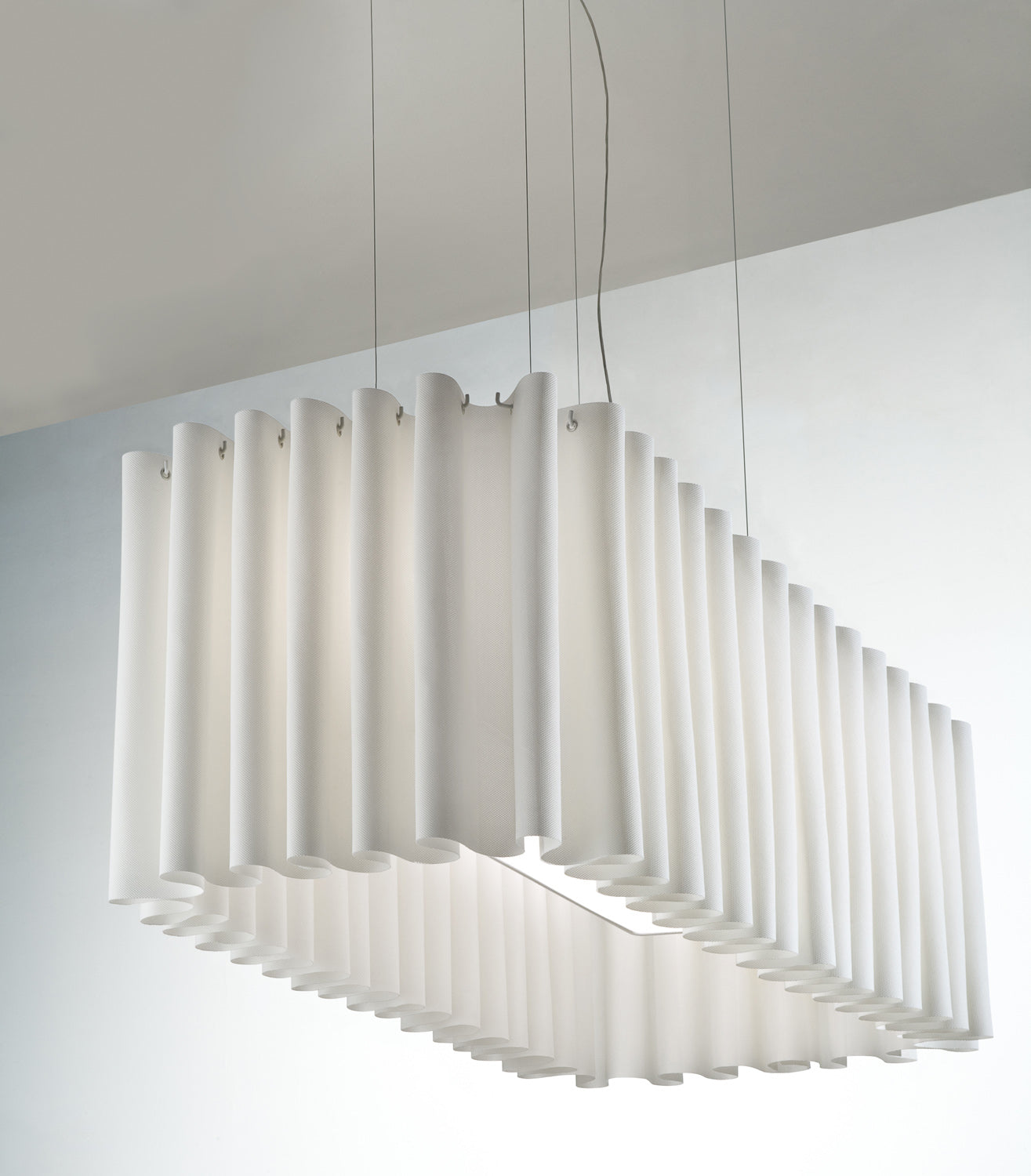 Skirt takes inspiration from the world of fashion. The result is a collection of pendant lamps with a unique and elegant design, given by its sinuous shapes. Skirt's refined design allows it to adapt to different types of environments, from domestic to contract and hospitality. It's lampshade is composed of a fabric that also has sound-absorbing properties, which allow it to reduce noise by up to 53%, thanks to its Equivalent Absorption Area which reaches a maximum of 3.55. Further, the shade has a double curtain effect in TREVIRA CS fabric, a fire retardant textile. Skirt is available in a variety of sizes and finish options.
