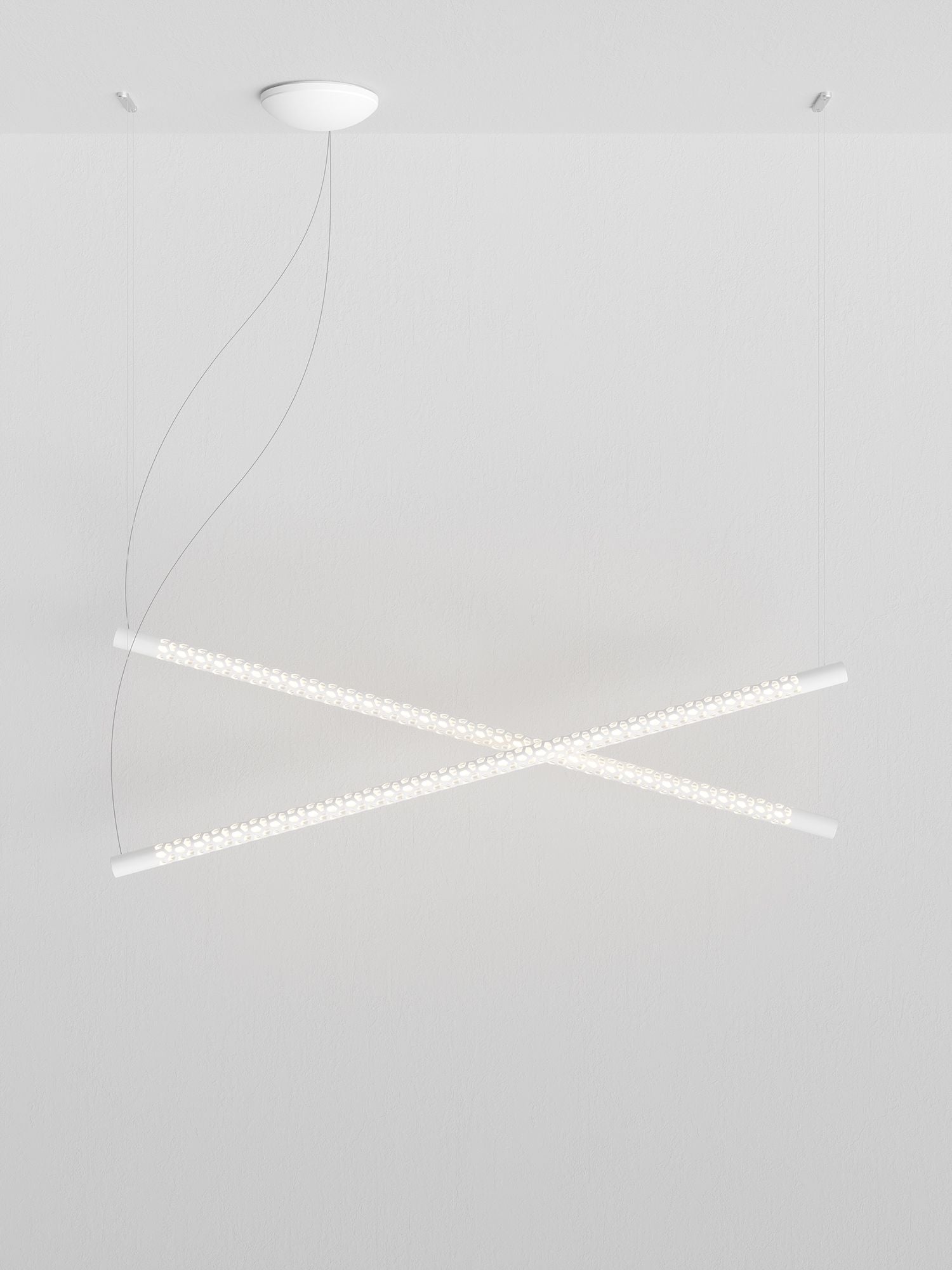 Inspired by the "Neon structure" by Lucio Fontana for the 9th Triennale of Milan, Squiggle is a suspended tubular exoskeleton containing an LED strip up to 6m long. A sequence of irregular hexagon-shaped holes allow light to escape the metal structure, projecting a complex array of geometric patterns, including broken curved lines and concentric rings. Squiggle comes in a wide range of designs and sizes to suit a myriad of installation possibilities, with all versions available in matt gold, black or white finish. Made in Italy.