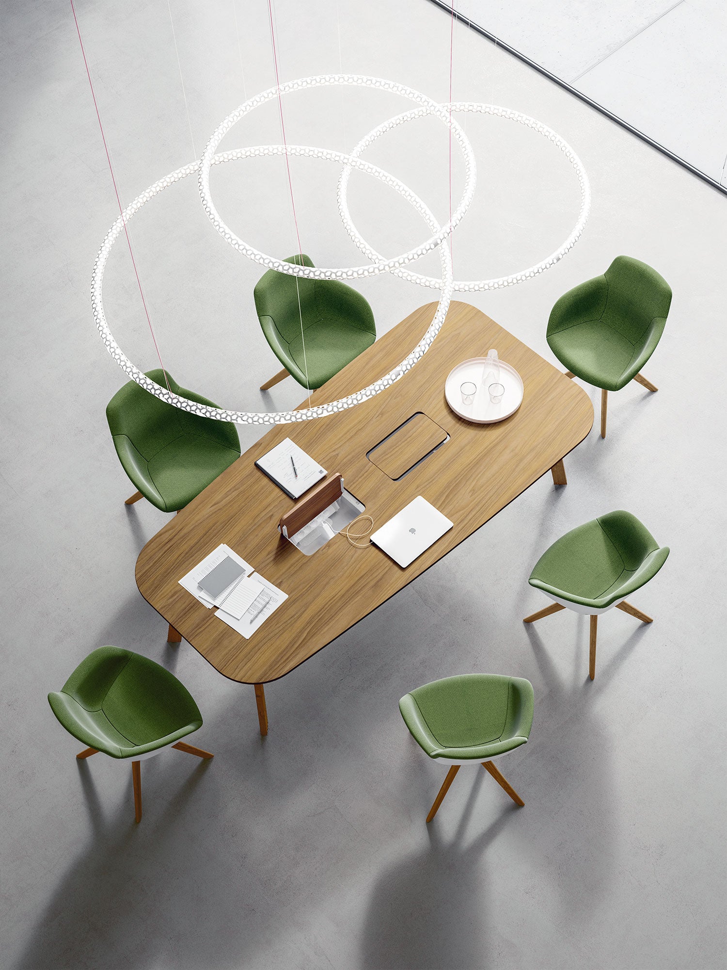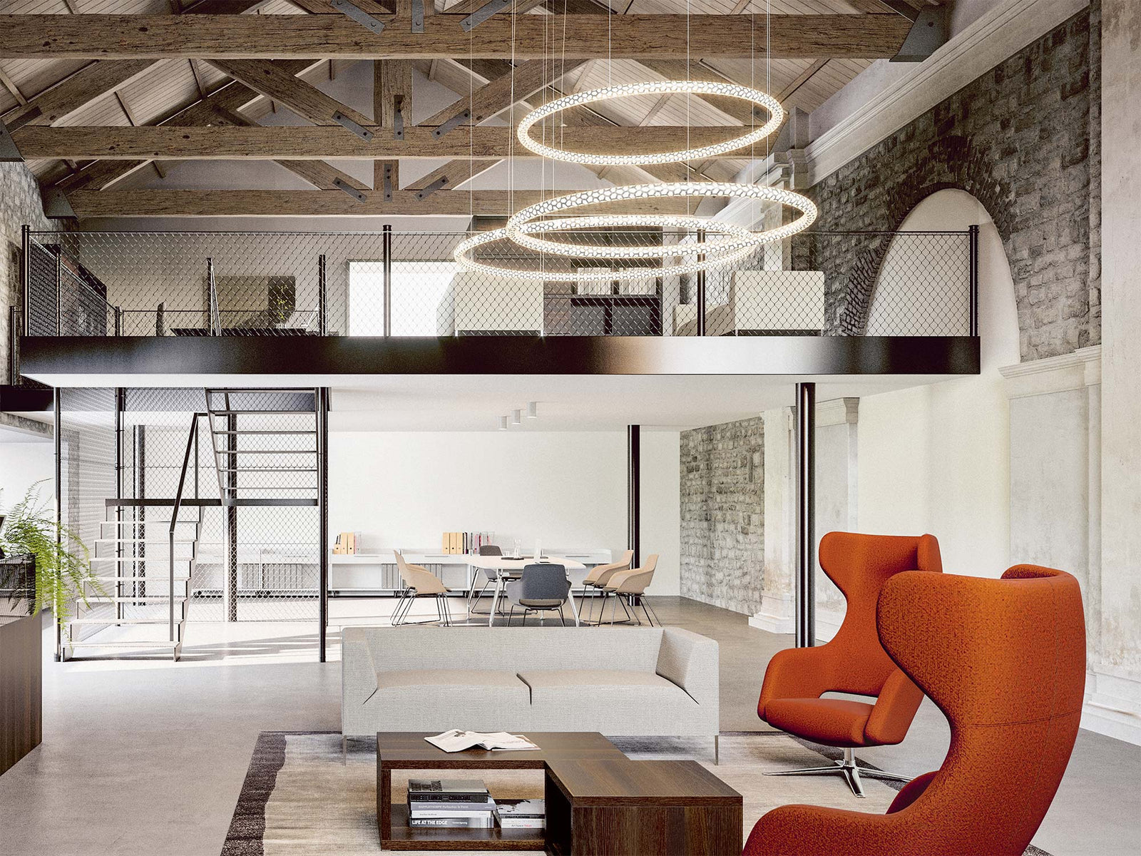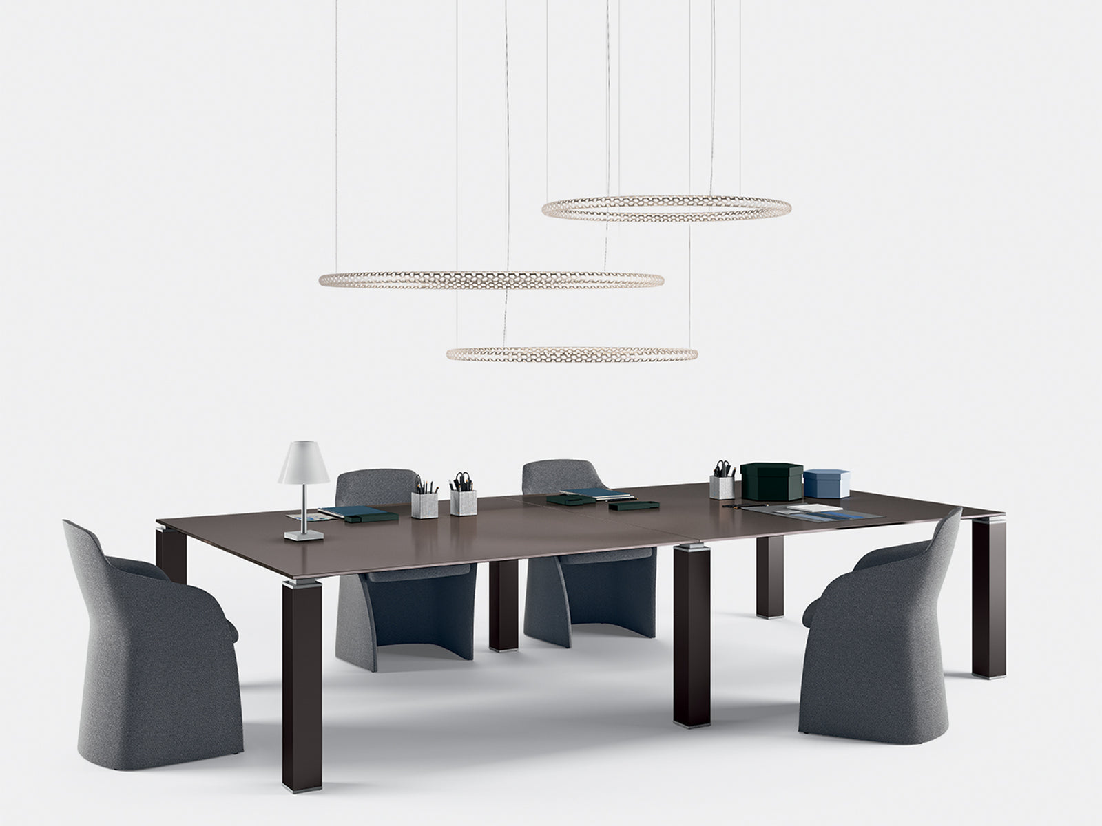 Inspired by the "Neon structure" by Lucio Fontana for the 9th Triennale of Milan, Squiggle is a suspended tubular exoskeleton containing an LED strip up to 6m long. A sequence of irregular hexagon-shaped holes allow light to escape the metal structure, projecting a complex array of geometric patterns, including broken curved lines and concentric rings. Squiggle comes in a wide range of designs and sizes to suit a myriad of installation possibilities, with all versions available in matt gold, black or white finish. Made in Italy.