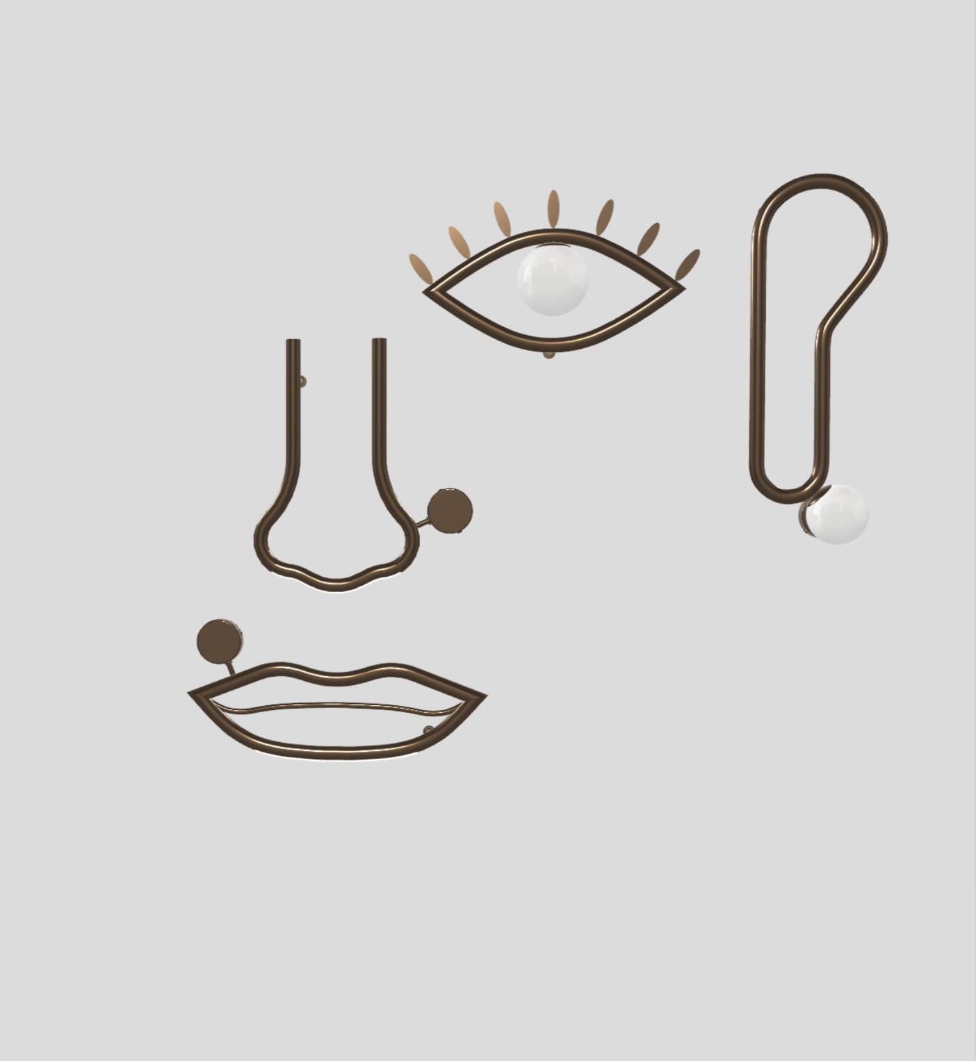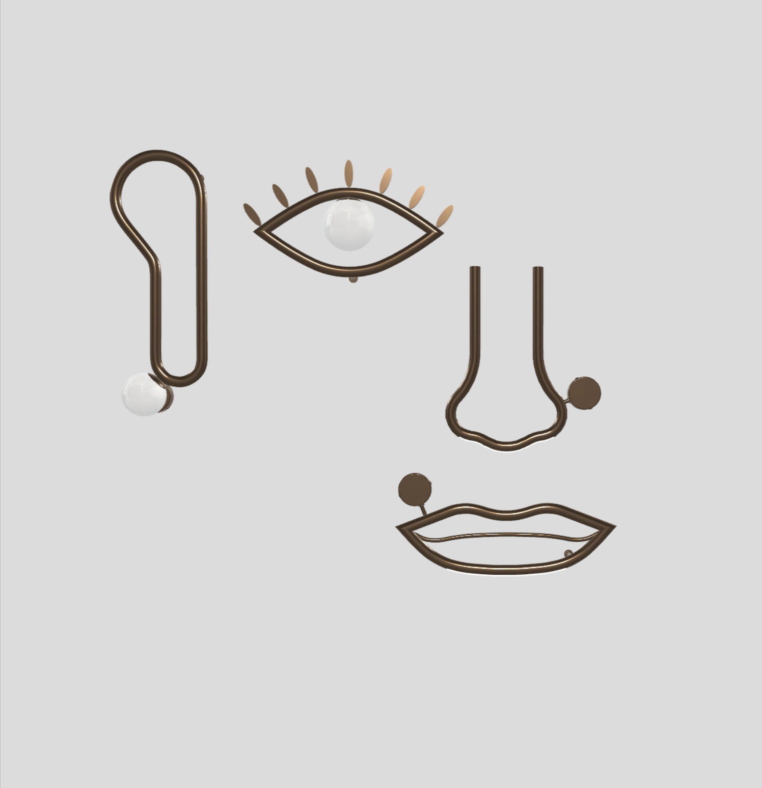 Combining the architectural and the glamorous, Visio has been designed as an homage to the iconographic apparatus and expressiveness of the face. With layers of meaning to be discovered from a range of different configurations, Visio can be used to generate a face in its entirety, or through compositions of mouths, noses, ears and eyes. Each component consists of a painted metal structure in polished dark chocolate tones, with an opal white Murano triplex glass diffuser and LED source.